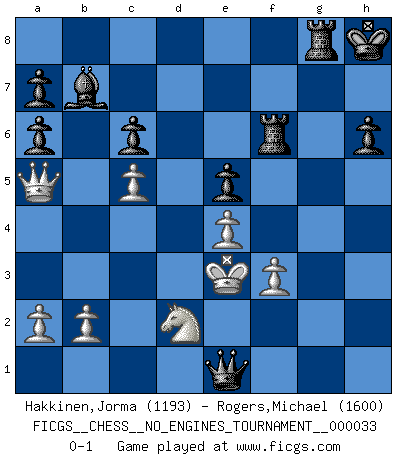 Last move : 0-1 2010 September 13 23:21:41 [Event "FICGS__CHESS__NO_ENGINES_TOURNAMENT__000033"] [Site "FICGS"] [Date "2010.09.09"] [Round "1"] [White "Hakkinen,Jorma"] [Black "Rogers,Michael"] [Result "0-1"] [WhiteElo "1193"] [BlackElo "1600"] 1.d4 f5 2.c4 Nf6 3.Nf3 d6 4.Nc3 g6 5.Bg5 Bg7 6.e3 O-O 7.Bd3 c6 8.O-O Qe8 9.Rc1 e5 10.dxe5 dxe5 11.Be2 h6 12.Bxf6 Bxf6 13.e4 f4 14.c5 Kh8 15.Qd6 Na6 16.Bxa6 bxa6 17.Qc7 Bg4 18.Rfd1 g5 19.h3 Rf7 20.Qa5 Bc8 21.Rd6 Bb7 22.Ne2 Qg8 23.Nd2 g4 24.hxg4 Qxg4 25.Kf1 Rg8 26.g3 fxg3 27.Nxg3 Qxg3 28.Rxf6 Rxf6 29.f3 Qg1+ 30.Ke2 Qxc1 31.Ke3 Qe1+ 0-1 Dutch defense Kingside Castling by player Black (move 6) Kingside Castling by player White (move 8) Player Black won this chess game. Follow this game move after move (download)Fischer is completely natural. He plays no roles. He's like a child. Very, very simple. (Zita Rajcsanyi) Als ich elf wurde, wurde ich einfach gut. (Robert James Fischer) La última cosa en que Fischer estaba interesado era en tonterías, siempre y cuando el Ajedrez estuviera involucrado. (Elie Agur) J'ai toujours senti une vague pitié pour l'homme qui ne connaît rien aux échecs, tout comme j'en aurais pour un homme ignorant de l'amour. Les Echecs, comme la musique ou comme l'amour, ont le pouvoir de rendre heureux. (Siegbert Tarrasch) Life is like a game of cards: the hand you are dealt represents determinism; the way you play it is free will. (Jawaharlal Nehru)