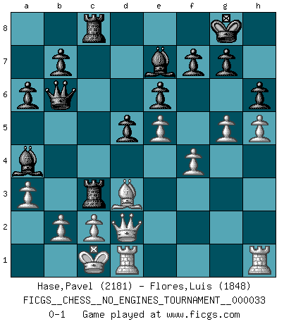 Last move : 0-1 2010 October 25 13:48:33 [Event "FICGS__CHESS__NO_ENGINES_TOURNAMENT__000033"] [Site "FICGS"] [Date "2010.09.09"] [Round "1"] [White "Hase,Pavel"] [Black "Flores,Luis"] [Result "0-1"] [WhiteElo "2181"] [BlackElo "1848"] 1.e4 c5 2.Nf3 d6 3.d4 cxd4 4.Nxd4 Nf6 5.Nc3 a6 6.Bg5 e6 7.f4 Qb6 8.a3 Nc6 9.Nb3 Be7 10.Qd2 O-O 11.O-O-O Rd8 12.Be2 h6 13.Bxf6 Bxf6 14.g4 Na5 15.Nd4 d5 16.e5 Be7 17.Nb3 Bd7 18.Nxa5 Qxa5 19.Nb1 Qb6 20.Bd3 Rac8 21.h4 Rc7 22.h5 Rdc8 23.g5 Ba4 24.Nc3 Rxc3 0-1 Sicilian : Najdorf, 7...Qb6 Kingside Castling by player Black (move 10) Queenside Castling by player White (move 11) Player Black won this chess game. Follow this game move after move (download)Half the variations which are calculated in a tournament game turn out to be completely superfluous. Unfortunately, no one knows in advance which half. (Jan Tinman) Deine Wertungszahl - vorausgesetzt einige Jahre schachliche Anstrengung - entspricht etwa dem zehnfachen Deines IQ plus 1000. (Jonathan Levitt) ¿Se han dado cuenta de que Fischer casi nunca ha tenido piezas malas? El las intercambia y las piezas malas se quedan con sus oponenets. (Yuri Balashov) Les échecs sont un jeu par leur forme, un art par leur essence et une science par sa difficulté d'acquisition. Ils peuvent vous procurer autant de plaisir qu'un bon livre ou une belle musique, mais vous n'aurez une réelle joie que si vous arrivez à bien jouer. (Tigran Petrosian) Wisdom begins at the end. (Daniel Webster)