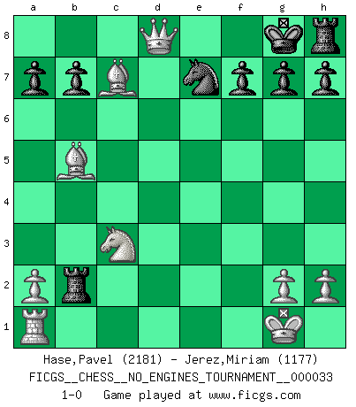 Last move : 1-0 2010 October 8 0:39:36 [Event "FICGS__CHESS__NO_ENGINES_TOURNAMENT__000033"] [Site "FICGS"] [Date "2010.09.09"] [Round "1"] [White "Hase,Pavel"] [Black "Jerez,Miriam"] [Result "1-0"] [WhiteElo "2181"] [BlackElo "1177"] 1.e4 e5 2.f4 d5 3.exd5 exf4 4.Nf3 Qxd5 5.Nc3 Qe6+ 6.Kf2 Bc5+ 7.d4 Bb6 8.Bb5+ Nc6 9.Re1 Bxd4+ 10.Nxd4 Kf8 11.Nxe6+ Bxe6 12.Bxf4 Rd8 13.Qf3 Nge7 14.Bxc7 Rd2+ 15.Kg1 Rxc2 16.Rxe6 Kg8 17.Rxe7 Nxe7 18.Qd3 Rxb2 19.Qd8+ 1-0 KGD : Falkbeer counter-gambit Player White won this chess game. Follow this game move after move (download)The boy (then a 12 year old boy named Anatoly Karpov) doesn't have a clue about Chess, and there's no future at all for him in this profession. (Mikhail Botvinnik) Jeder Fehler erscheint unglaublich dumm, wenn andre ihn begehen. (Georg Christoph Lichtenberg) El sobresalir en el Ajedrez es un signo de una mente intrigante. (Sir Arthur Conan Doyle) Toutes choses étant égales, c'est la conviction qui gagne. Alliée à une volonté de vaincre, elle sert de détonateur, suscite des idées, disperse les doutes et aide à penser clairement. (Robert Fischer) Looking at the proliferation of personal web pages on the Net, it looks like very soon everyone on Earth will have 15 megabytes of fame. (M.G. Sriram)