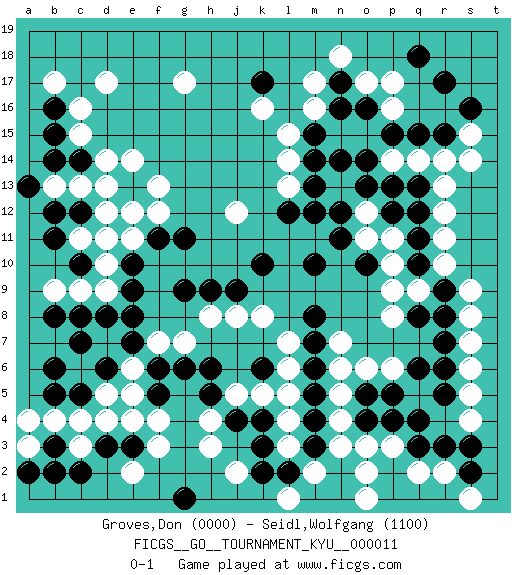 Last move : 0-1 2007 January 26 4:52:39 [Event "FICGS__GO__TOURNAMENT_KYU__000011"] [Site "FICGS"] [Date "2006.11.22"] [Round "1"] [Black "Groves,Don"] [White "Seidl,Wolfgang"] [Result "0-1"] [Rating 1 "0000"] [Rating 2 "1100"] 1.q3 d17 2.r17 c4 3.r5 c15 4.k17 g17 5.k4 f3 6.r9 p17 7.q15 m17 8.o16 p16 9.p15 o17 10.n16 m16 11.n17 n18 12.m15 l15 13.m14 k16 14.o13 r11 15.q12 r12 16.q11 r14 17.q13 r13 18.r15 r10 19.q10 s9 20.r8 s8 21.r7 s15 22.s16 s14 23.q18 n13 24.n14 c6 25.c10 h3 26.d13 c13 27.c12 b13 28.b12 l3 29.k3 o3 30.o4 n4 31.o5 n5 32.k6 p3 33.p4 q2 34.r3 d12 35.d11 e12 36.c8 e11 37.e10 e5 38.e7 d9 39.e9 n7 40.m12 k8 41.h6 g7 42.g6 f7 43.f6 e6 44.c7 d7 45.e8 d10 46.d8 c11 47.d6 d5 48.b11 d11 49.b6 c9 50.c5 b9 51.b8 b4 52.b5 h8 53.n2 m2 54.m1 l1 55.n1 n3 56.m4 o2 57.m3 o1 58.k2 l4 59.m5 o6 60.l2 l5 61.m6 l6 62.m7 l7 63.m8 p6 64.q4 n6 65.m10 k5 66.g9 j8 67.f11 l13 68.m13 f12 69.g11 j5 70.e13 f13 71.b14 d14 72.c14 e14 73.a13 d13 74.b15 c16 75.b16 b17 76.d3 d4 77.e3 f4 78.f5 e4 79.j4 h4 80.h5 r2 81.s2 s6 82.r6 s4 83.s3 s5 84.k10 q9 85.q8 p9 86.q6 p8 87.p5 s7 88.h9 s1 89.j9 l14 90.l12 o11 91.o10 p10 92.n11 p11 93.p12 o12 94.n12 q14 95.p13 p14 96.o14 j12 97.b3 a3 98.a2 a4 99.b2 c3 100.c2 e2 101.g1 j2 0-1 Here are the names of the openings (joseki) played in the four corners : Corner q16 : r17 p17 San-San (Sam-Sam, San-San) 3-3 Point. The San-San (3-3) point, emphasizing territory at the expense of influence. Ikken Kakari (Hankan Keolch'im, Yi Gua`, Jiao~, 1-Space Approach). Black may continue by playing 4-5, 3-5, 4-6, 3-6 or 5-4. Player White won this Go (weiqi, baduk) game. Follow this game move after move (download)Sacrifice for shape. (Anonymous) God, you are such an idiot. - Actually, I thought I was more of a jerk. (Gregory House to Stacy Warner, House M.D.)