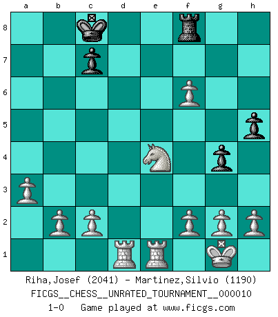 Last move : 1-0 2010 December 27 10:56:21 [Event "FICGS__CHESS__UNRATED_TOURNAMENT__000010"] [Site "FICGS"] [Date "2010.09.11"] [Round "1"] [White "Riha,Josef"] [Black "Martinez,Silvio"] [Result "1-0"] [WhiteElo "2041"] [BlackElo "1190"] 1.e4 e5 2.Nf3 Nc6 3.Bb5 Nge7 4.O-O d5 5.Nxe5 Bd7 6.Nxc6 Nxc6 7.exd5 Ne7 8.Qe2 Bxb5 9.Qxb5+ Qd7 10.Qxb7 Nxd5 11.Qxa8+ Qd8 12.Qxa7 Be7 13.Qa4+ Qd7 14.Qa8+ Qd8 15.Qxd8+ Kxd8 16.a3 Nf4 17.Nc3 Kc8 18.d4 Bf6 19.Bxf4 g5 20.Be5 Bxe5 21.dxe5 f5 22.exf6 Rf8 23.Ne4 h5 24.Rad1 g4 25.Rfe1 1-0 Ruy Lopez : Cozio defense Kingside Castling by player White (move 4) Player White won this chess game. Follow this game move after move (download)It is not enough to be a good player... you must also play well. (Siegbert Tarrasch) Wenn Dein Gegner dir ein Remis anbietet, versuch herauszufinden, weshalb er glaubt schlechter zu stehen. (Nigel Short) El sobresalir en el Ajedrez es un signo de una mente intrigante. (Sir Arthur Conan Doyle) Le temps de noter son nom sur la feuille de partie, j'étais déjà en zeitnot ! D'un modeste amateur apparié lors de la première ronde d'un open contre le grand-maître Azmaïparashvili. I know the human being and fish can coexist peacefully. (George W. Bush, Saginaw sept. 29, 2000)
