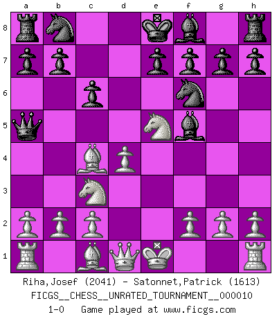 Last move : 1-0 2010 October 21 22:6:20 [Event "FICGS__CHESS__UNRATED_TOURNAMENT__000010"] [Site "FICGS"] [Date "2010.09.11"] [Round "1"] [White "Riha,Josef"] [Black "Satonnet,Patrick"] [Result "1-0"] [WhiteElo "2041"] [BlackElo "1613"] 1.e4 d5 2.exd5 Qxd5 3.Nc3 Qa5 4.d4 Nf6 5.Nf3 c6 6.Bc4 Bf5 7.Ne5 1-0 This chess game has been lost on time (started : 2010.09.11 13:7:37) Scandinavian (centre counter) defense Player White won this chess game. Follow this game move after move (download)You need not play well - just help your opponent to play badly. (Genrikh Chepukaitis) Ich hatte meine größten Erfolge, als ich 47 Jahre alt war. Kasparow war noch nicht mal 42 und hat das Schach schon im Stich gelassen. (Viktor Kortschnoi) No existe un remordimiento como el remordimiento del Ajedrez. (H. G. Wells) Les Echecs, c'est l'art de la guerre sans les charniers, c'est la résurrection des morts tombés au champ d'honneur, l'espoir perpétuel, la suprématie de l'intelligence sur la force, la culture de l'esprit. (F. Szpiner) A good player is always lucky. (Capablanca)