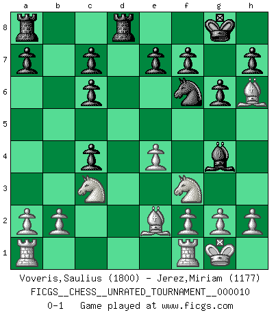 Last move : 0-1 2010 November 28 10:48:39 [Event "FICGS__CHESS__UNRATED_TOURNAMENT__000010"] [Site "FICGS"] [Date "2010.09.11"] [Round "1"] [White "Voveris,Saulius"] [Black "Jerez,Miriam"] [Result "0-1"] [WhiteElo "1800"] [BlackElo "1177"] 1.d4 d5 2.c4 dxc4 3.Nf3 Nf6 4.e3 Be6 5.Nc3 Nc6 6.Be2 g6 7.O-O Bh6 8.e4 O-O 9.Bxh6 Re8 10.d5 Bg4 11.dxc6 bxc6 12.Qxd8 Rexd8 0-1 QGA, Flohr variation Kingside Castling by player White (move 7) Kingside Castling by player Black (move 8) Player Black won this chess game. Follow this game move after move (download)Some sacrifices are sound; the rest are mine. (Mikhail Tal) Woher wissen wir, daß der Neanderthaler Blindschach gespielt hat? -- Bei Ausgrabungen wurden keine Schachbretter und Figuren gefunden. (Anonymous) Nunca nadie ha ganado una partida de Ajedrez rindiendose. (Unknown) Les ravages du H expliquent la différence de niveau entre Tal et Thal [Abergel]. The difference between perseverance and obstinacy is that one comes from a strong will, and the other from a strong won't. (Henry Ward Beecher)