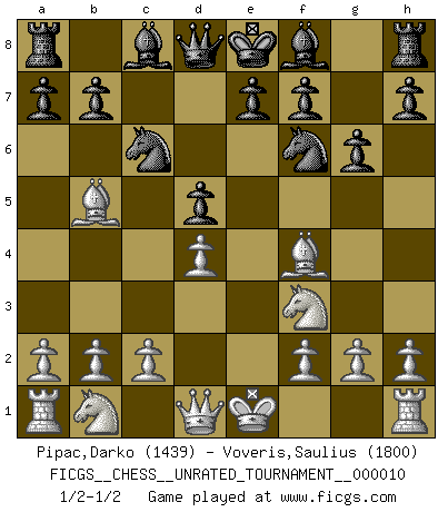Last move : 1/2-1/2 2010 September 25 22:51:32 [Event "FICGS__CHESS__UNRATED_TOURNAMENT__000010"] [Site "FICGS"] [Date "2010.09.11"] [Round "1"] [White "Pipac,Darko"] [Black "Voveris,Saulius"] [Result "1/2-1/2"] [WhiteElo "1439"] [BlackElo "1800"] 1.e4 c6 2.Nf3 d5 3.exd5 cxd5 4.d4 Nf6 5.Bf4 Nc6 6.Bb5 g6 1/2-1/2 Caro-Kann defense This chess game ended in a draw. Follow this game move after move (download)The blunders are all there on the board, waiting to be made. (Savielly Tartakover) Der zweitbeste Zug ist oft der einzig richtige. (Savielly Grigorievitsch Tartakower) La estratégia requiere pensar, la táctica requiere observación. (Max Euwe) Seul un grand joueur sait à quel point il joue faiblement. (Xavier Tartacover) He who is a good ruler must first have been ruled. (Aristotle)
