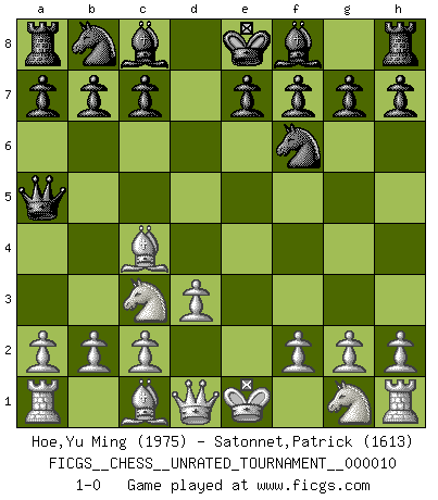 Last move : 1-0 2010 October 22 22:7:35 [Event "FICGS__CHESS__UNRATED_TOURNAMENT__000010"] [Site "FICGS"] [Date "2010.09.11"] [Round "1"] [White "Hoe,Yu Ming"] [Black "Satonnet,Patrick"] [Result "1-0"] [WhiteElo "1975"] [BlackElo "1613"] 1.e4 d5 2.exd5 Qxd5 3.Nc3 Qa5 4.Bc4 Nf6 5.d3 1-0 This chess game has been lost on time (started : 2010.09.11 13:7:37) Scandinavian (centre counter) defense Player White won this chess game. Follow this game move after move (download)One doesn't have to play well, it's enough to play better than your opponent. (Siegbert Tarrasch) Dieses schreckliche Gefühl, dass ich gegen eine Maschine spielte, die niemals Fehler macht, zerschmetterte meinen Widerstand. (Mark Taimanov) Yo considero que Fischer es uno de los expertos mas grandes de aperturas de siempre. (Keith Hayward) Celui qui prend des risques peut perdre, celui qui n'en prend pas perd toujours. (Xavier Tartacover) It's not a bug - it's an undocumented feature. (Anonymous)