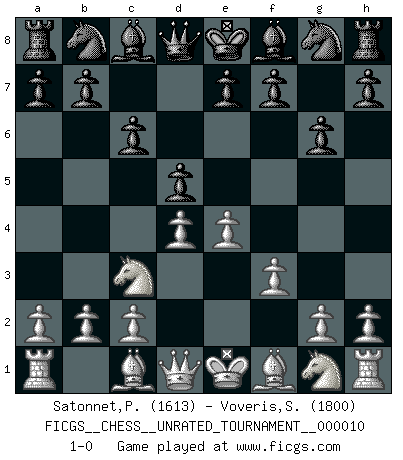 Last move : 1-0 2010 November 7 9:52:41 [Event "FICGS__CHESS__UNRATED_TOURNAMENT__000010"] [Site "FICGS"] [Date "2010.09.11"] [Round "1"] [White "Satonnet,Patrick"] [Black "Voveris,Saulius"] [Result "1-0"] [WhiteElo "1613"] [BlackElo "1800"] 1.e4 c6 2.d4 d5 3.f3 g6 4.Nc3 1-0 This chess game has been lost on time (started : 2010.09.11 13:7:37) Caro-Kann : Tartakower (fantasy) variation Player White won this chess game. Follow this game move after move (download)Chess is a terrible game. If you have no center, your opponent has a freer position. If you do have a center, then you really have something to worry about ! (Siegbert Tarrasch) Die Jungen erwarten, dass Opa einfach umfällt. Dann aber kann Opa fünf Stunden lang Schach spielen und die jungen Gegner an die Wand drücken. (Viktor Kortschnoi) Estaba muy claro de que el punto vulnerable del Gran Maestro Americano (Bobby Fischer) radicaba en las posiciones de doble filo, colgantes, irracionales, donde el siempre falló en encontrar un triunfo aún en una posición de clara victoria. (Efim Geller) Dans le domaine de la peinture, de la gravure et de la sculpture, dès la première décennie de notre siècle, les artistes abandonnent la représentation de la partie d'échecs pour se concentrer sur les pièces, sur les échiquiers et sur toutes les variations auxquelles les unes et les autres peuvent donner lieu. On passe en quelque sorte d'un thème social à un thème musical (au sens de la musica médiévale, c'est-à-dire d'une notion qui inclue le rythme, l'harmonie, la construction et la déconstruction, etc.). Graphiquement et picturalement, l'échiquier apparaît comme une structure ouverte, dynamique, d'une richesse infinie, autorisant toutes les combinatoires et débouchant sur des mouvements et des rythmes de nature exponentielle. (Michel Pastoureau) Mandala - that's it! 16x16 squares as multiple of the four and the eight because of the Four Noble Truths and the Noble Eightfold Path. (Heinz-Georg Lehnhoff about Big Chess)