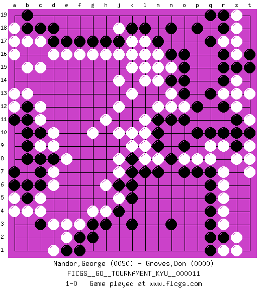 Last move : 1-0 2006 December 11 21:0:42 [Event "FICGS__GO__TOURNAMENT_KYU__000011"] [Site "FICGS"] [Date "2006.11.22"] [Round "1"] [Black "Nandor,George"] [White "Groves,Don"] [Result "1-0"] [Rating 1 "0050"] [Rating 2 "0000"] 1.q17 c4 2.r15 c17 3.q3 e3 4.k3 d10 5.r10 k17 6.e17 f16 7.f17 e16 8.h17 h16 9.k18 j18 10.l18 l17 11.j17 j16 12.g17 g16 13.c16 d16 14.d17 c15 15.b16 b17 16.c18 b15 17.b18 a16 18.m17 k16 19.g3 g4 20.h3 h4 21.j4 r5 22.q5 r3 23.r2 r4 24.q4 r7 25.q7 s2 26.q2 s1 27.m15 q8 28.q6 r6 29.p10 q9 30.q10 r9 31.k6 k10 32.k8 g10 33.m10 o8 34.o7 m8 35.m7 l9 36.m9 l8 37.l7 h6 38.m13 k13 39.c7 d7 40.c10 c9 41.b9 c11 42.b10 d9 43.c8 d6 44.c6 c5 45.b5 b4 46.b11 b7 47.a7 c12 48.b12 b13 49.n3 l11 50.m11 j7 51.k7 j5 52.k5 j8 53.k14 l14 54.l13 j14 55.k12 k15 56.k11 l10 57.l12 j12 58.j11 h11 59.n8 j10 60.o9 p8 61.p7 m16 62.n16 l16 63.n18 m14 64.n14 n13 65.o13 m12 66.o15 n12 67.n11 o12 68.p12 l15 69.o11 n15 70.o14 f3 71.o16 m15 72.s9 s8 73.s10 t9 74.c3 d3 75.f2 e2 76.g2 a5 77.b6 k9 78.a6 a4 79.t10 t7 80.d8 e8 81.b8 t8 82.j6 r1 83.q1 a18 84.b19 a12 85.a11 a13 86.e1 d1 87.f1 r17 88.r18 s18 89.r16 q18 90.r19 s17 91.p18 s19 92.q19 s16 93.s15 s14 94.t16 t11 95.r14 s13 96.r12 a17 97.d18 s12 98.s11 t13 99.t15 r13 100.q13 1-0 Here are the names of the openings (joseki) played in the four corners : Corner d16 : c17 e17 San-San (Sam-Sam, San-San) 3-3 Point. The San-San (3-3) point, emphasizing territory at the expense of influence. Ikken Kakari (Hankan Keolch'im, Yi Gua`, Jiao~, 1-Space Approach). White may continue by playing 4-5, 3-5, 4-6, 3-6 or 5-4. Corner q4 : q3 r5 Komoku (Somok, Xiao~mu`) 3-4 Point. The komoku (3-4) point is the traditional corner enclosure move.. Ikken Kakari (Hankan Keolch'im, Yi Gua`jiao~, 1-Space Low Pincer). The small knight move is the basic approach move to the 3-4 point stone. It has been continually used for over four centuries. There are limitless variations, with new moves constantly being discovered. White 2 opens the door to a treaure store of joseki. Player Black won this Go (weiqi, baduk) game. Follow this game move after move (download)If there is no stone on the handicap point, the carpenter's square is dead. (Anonymous) Only sick music makes money today. (Friedrich Nietzsche)