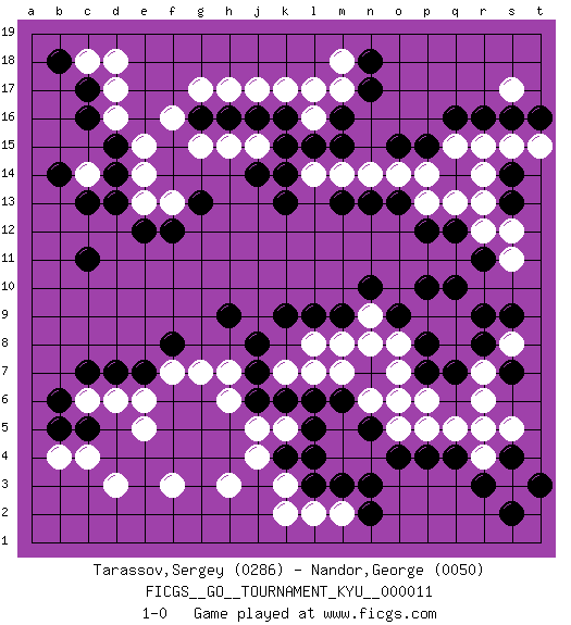 Last move : 1-0 2006 December 21 19:56:30 [Event "FICGS__GO__TOURNAMENT_KYU__000011"] [Site "FICGS"] [Date "2006.11.22"] [Round "1"] [Black "Tarassov,Sergey"] [White "Nandor,George"] [Result "1-0"] [Rating 1 "0286"] [Rating 2 "0050"] 1.q16 d17 2.q4 c4 3.d15 g17 4.c17 c18 5.c16 k17 6.n17 f3 7.c11 k3 8.n3 r6 9.r8 r4 10.r3 q5 11.p4 s3 12.s4 r5 13.s2 p5 14.n5 s5 15.t3 s8 16.s7 q8 17.s9 r7 18.r9 q9 19.q10 n6 20.o6 o5 21.n7 p6 22.m6 r12 23.r11 r15 24.r16 q15 25.p15 p14 26.o15 o14 27.c7 e15 28.d14 e14 29.e12 e5 30.p12 s11 31.q12 r13 32.s14 s15 33.s16 t15 34.s13 s12 35.o9 o7 36.o4 o8 37.n8 p9 38.p7 n6 39.q7 q13 40.p10 k5 41.l5 k7 42.k9 h3 43.k15 m18 44.n18 m17 45.m16 l16 46.m15 m14 47.l15 g15 48.e7 h7 49.h9 f7 50.f8 g7 51.n13 n14 52.m13 p13 53.g13 l14 54.k13 j15 55.j14 h15 56.b5 b4 57.c5 m2 58.n2 l8 59.l9 r14 60.l3 l2 61.m3 c14 62.c13 f13 63.f12 e13 64.d13 d16 65.b18 d18 66.b14 d6 67.d7 e6 68.k4 j4 69.l4 k2 70.k6 j5 71.j6 h6 72.j7 c6 73.b6 d3 74.k16 l17 75.j16 j17 76.h16 h17 77.g16 f16 78.k14 s17 79.t16 n9 80.p8 o6 81.o13 l7 82.j8 m7 83.n10 m8 84.m9 n8 85.l6 1-0 Here are the names of the openings (joseki) played in the four corners : Corner d16 : d17 d15 Komoku (Somok, Xiao~mu`) 3-4 Point. The komoku (3-4) point is the traditional corner enclosure move.. Ikken Takagakari (Hankan Nop'dakeolch'im, Yi Gaogua`jiao~, 1-Space High Approach). The 5-4 approach move has become more popular in modern times, as modern Go emphasizes speed and influence. Player Black won this Go (weiqi, baduk) game. Follow this game move after move (download)Ikken tobi is never wrong. (Anonymous) Experience is the name we all give to our mistakes. (Oscar Wilde)