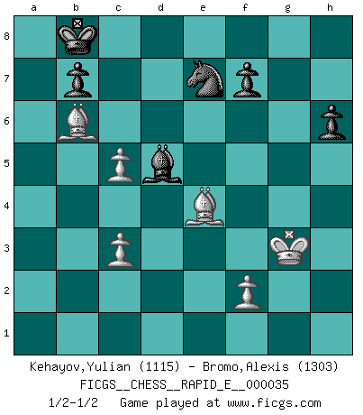 Last move : 1/2-1/2 2010 December 14 10:27:9 [Event "FICGS__CHESS__RAPID_E__000035"] [Site "FICGS"] [Date "2010.09.14"] [Round "1"] [White "Kehayov,Yulian"] [Black "Bromo,Alexis"] [Result "1/2-1/2"] [WhiteElo "1115"] [BlackElo "1303"] 1.e4 e5 2.d4 d6 3.dxe5 dxe5 4.Qxd8+ Kxd8 5.Nf3 Nc6 6.c4 Nf6 7.Nc3 Bb4 8.Be2 Re8 9.O-O Bxc3 10.bxc3 Be6 11.Bg5 h6 12.Bxf6+ Ne7 13.Rad1+ Bd7 14.Bxg7 Rg8 15.Bxe5 Ke8 16.Bxc7 Bh3 17.c5 Bxg2 18.Rfe1 Bxf3 19.Kf1 Bg2+ 20.Kg1 Bxe4 21.Kf1 Rc8 22.Bd6 Nf5 23.h3 Bg2+ 24.Kg1 Bxh3 25.Kh1 Kd7 26.Bb8 Kc6 27.Bxa7 Rg6 28.Bf3+ Kc7 29.Rb1 Rcg8 30.Rg1 Rxg1+ 31.Rxg1 Rxg1+ 32.Kxg1 Ne7 33.Kh2 Be6 34.Bb6+ Kb8 35.Be4 Bxa2 36.Kg3 Bd5 1/2-1/2 King's pawn game Kingside Castling by player White (move 9) This chess game ended in a draw. Follow this game move after move (download)Fischer was a master of clarity and a king of artful positioning. His opponents would see where he was going but were powerless to stop him. (Bruce Pandolfini) Wenn ein Kopf und ein Buch zusammenstoßen und es klingt hohl, ist es denn allemal im Buche? (Georg Christoph Lichtenberg) Hay jugadores fuertes y personas amables y yo soy un jugador fuerte. (Bobby Fischer) Votre prénom est 'Tactique', votre deuxième prénom est 'Tactique' et votre nom est 'Tactique'. (Ken Smith) I find your interest interesting. (Gregory House, House M.D.)