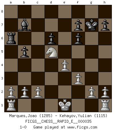 Last move : 1-0 2010 October 20 20:55:33 [Event "FICGS__CHESS__RAPID_E__000035"] [Site "FICGS"] [Date "2010.09.14"] [Round "1"] [White "Marques,Joao"] [Black "Kehayov,Yulian"] [Result "1-0"] [WhiteElo "1285"] [BlackElo "1115"] 1.e4 c5 2.Nf3 Nc6 3.d4 cxd4 4.Nxd4 e5 5.Nf3 Bd6 6.Bb5 Nf6 7.Nc3 O-O 8.Qxd6 Qe7 9.Qxe7 Nxe7 10.Bg5 b6 11.Nxe5 Bb7 12.f3 d6 13.Bxf6 gxf6 14.Nd7 a6 15.Nxf8 axb5 16.Nd7 Kg7 17.Nxb6 Ra6 18.Nbd5 Nxd5 19.Nxd5 1-0 Sicilian : Labourdonnais-Loewenthal variation Kingside Castling by player Black (move 7) Player White won this chess game. Follow this game move after move (download)The hallmark of the artist is simplicity. (Larry Evans) Ich verlor meine Bürgerrechte, mein Gehalt wurde mir nicht mehr bezahlt und ich wurde zensiert und durfte nicht mehr ins Ausland reisen. [nach dem Match Fischer-Taimanov 6:0] (Mark Taimanov) Cualquier cambio de material en una posición debe venir por medio de un mate, una captura o promoción de Peón. (Purdy) La vie est comme un jeu d'échecs : nous esquissons un plan, mais celui-ci est tributaire de ce que daignent faire l'adversaire aux échecs et le destin dans la vie. (Arthur Schopenhauer) All battles are fought by scared men who'd rather be someplace else. (John Wayne in the movie In harm's way)