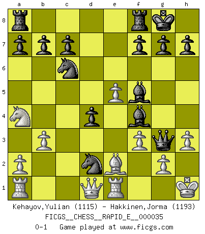 Last move : 0-1 2010 September 18 6:59:11 [Event "FICGS__CHESS__RAPID_E__000035"] [Site "FICGS"] [Date "2010.09.14"] [Round "1"] [White "Kehayov,Yulian"] [Black "Hakkinen,Jorma"] [Result "0-1"] [WhiteElo "1115"] [BlackElo "1193"] 1.d3 e5 2.e4 Nc6 3.Nf3 Bc5 4.Be2 Nf6 5.O-O O-O 6.c3 d6 7.d4 exd4 8.cxd4 Bb6 9.Be3 d5 10.e5 Ne4 11.Nc3 Bf5 12.Nd2 Bxd4 13.f3 Bxe3+ 14.Kh1 Nxd2 15.Re1 d4 16.Na4 Qh4 17.b3 Bf4 18.h3 Qg3 0-1 Mieses Opening Kingside Castling by player White (move 5) Kingside Castling by player Black (move 5) Player Black won this chess game. Follow this game move after move (download)When I asked Fischer why he had not played a certain move in our game, he replied: 'Well, you laughed when I wrote it down !' (Mikhail Tal) Ich rechne überhaupt nicht voraus. Ich gewinne auch so. (Robert James Fischer) Te sientas frente a un tablero y repentinamente tu corazón brinca. Tu mano tiembla al tomar una pieza y moverla. Pero lo que el Ajedrez te enseña es que tu debes permanecer ahí con calma y pensar de que si realmente es una buena idea o de que si hay otras ideas mejores. (Stanley Kubrick) Roi des jeux et jeu des rois, les échecs portent en eux un sentiment d'infini. Ils donnent à celui qui s'est efforcé d'en approfondir les arcanes l'impression de n'être pas à la mesure de l'homme; en fait, ils constituent un résumé de l'univers, un microcosme, et figurent cette grande échelle qui, dans les plans de la lumière descend jusqu'à la matière, qui des abîmes insondables remonte jusqu'en l'infini de Dieu. (Pyrame) The beginning of wisdom is silence. The second step is listening. (Unknown)