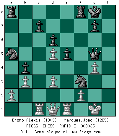 Last move : 0-1 2010 December 15 8:56:31 [Event "FICGS__CHESS__RAPID_E__000035"] [Site "FICGS"] [Date "2010.09.14"] [Round "1"] [White "Bromo,Alexis"] [Black "Marques,Joao"] [Result "0-1"] [WhiteElo "1303"] [BlackElo "1285"] 1.e4 e5 2.Nf3 Nc6 3.Bb5 a6 4.Ba4 b5 5.Bb3 Nf6 6.d3 Be7 7.O-O O-O 8.Nc3 Bb7 9.Be3 b4 10.Na4 a5 11.Nc5 Bc8 12.Ng5 d6 13.Na4 Ng4 14.c3 Bxg5 15.Bxg5 Qxg5 16.h3 Nh6 17.Bd5 Bb7 18.cxb4 axb4 19.b3 Na5 20.Nb2 Bxd5 21.exd5 Nf5 22.Nc4 Nh4 23.Ne3 f5 24.Re1 f4 25.Ng4 h5 26.Rc1 hxg4 27.hxg4 f3 28.gxf3 Nxf3+ 0-1 Ruy Lopez : Caro variation Kingside Castling by player White (move 7) Kingside Castling by player Black (move 7) Player Black won this chess game. Follow this game move after move (download)In a gambit you give up a Pawn for the sake of getting a lost game. (Samuel Standige Boden) Kritik überlasse ich den Spießern. Ich zeige nichts, wofür ich mich schämen muss. (Alexandra Kosteniuk) El Ajedrez expande y enriquece tu mente. (Saudin Robovic) Des points faibles ou des trous dans la position de l'adversaire doivent être occupés par des pièces et non pas par des pions. (Siegbert Tarrasch) Chess is everything: art, science and sport. (Anatoly Karpov)