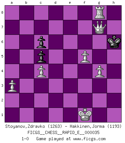 Last move : 1-0 2010 September 24 14:12:19 [Event "FICGS__CHESS__RAPID_E__000035"] [Site "FICGS"] [Date "2010.09.14"] [Round "1"] [White "Stoyanov,Zdravko"] [Black "Hakkinen,Jorma"] [Result "1-0"] [WhiteElo "1263"] [BlackElo "1193"] 1.e4 e5 2.Nf3 Nc6 3.Bb5 Nf6 4.Bxc6 bxc6 5.d3 d6 6.Bg5 Be7 7.O-O O-O 8.h3 Bb7 9.Re1 c5 10.Nbd2 Re8 11.a3 Bf8 12.c4 g6 13.Qb3 Rb8 14.Qa4 a6 15.Qd1 Bg7 16.Nb3 Qd7 17.Na5 h6 18.Nxb7 Rxb7 19.b3 hxg5 20.Nxg5 Bh6 21.Nf3 Kg7 22.Rb1 Nh5 23.b4 Nf4 24.Kh2 g5 25.bxc5 Rxb1 26.Qxb1 g4 27.Nh4 gxh3 28.g3 Ng6 29.Nf5+ Kh7 30.Qb7 dxc5 31.Kxh3 Ne7 32.g4 Nxf5 33.exf5 Qxd3+ 34.Kg2 Qd7 35.Qxa6 e4 36.Qb5 e3 37.Qxd7 exf2 38.Qxf7+ Bg7 39.Rxe8 c6 40.Rg8 f1Q+ 41.Kxf1 Kh6 42.Qxg7+ 1-0 Ruy Lopez : Berlin defense Kingside Castling by player White (move 7) Kingside Castling by player Black (move 7) Promotion Queen by player Black (move 40) 10 pieces endgame at move 42 : White KQRPPPP , Black KPP WHITE : King + 1 Queen 1 Rook 4 Pawns BLACK : King + 2 Pawns Player White won this chess game. Follow this game move after move (download)The way he plays Chess demonstrates a man's whole nature. (Stanley Ellin) Mit sehr nachdenklichem Gesicht schreitet Bobby durch den Turniersaal. Was ist passiert?, fragt Lombardy. Ich stehe schlecht, antwortet Fischer. Lombardy: Dann biete doch einfach Remis an. Fischer: So schlecht stehe ich nun auch wieder nicht! (Robert James Fischer) Tu sabes, camarada Pachman, no disfruto el ser un Ministro, preferería jugar al Ajedrez como tu. (Che Guevara) Même un GMI sait rarement calculer sur plus de cinq coups une attaque à sacrifices. (Rudolf Spielmann) Wipe them out. All of them. (Darth Sidious in Star Wars ep.1)