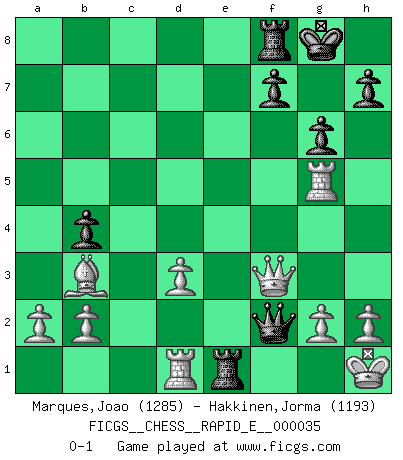 Last move : 0-1 2010 October 27 12:19:46 [Event "FICGS__CHESS__RAPID_E__000035"] [Site "FICGS"] [Date "2010.09.14"] [Round "1"] [White "Marques,Joao"] [Black "Hakkinen,Jorma"] [Result "0-1"] [WhiteElo "1285"] [BlackElo "1193"] 1.e4 e5 2.Nf3 Nc6 3.Bb5 d6 4.O-O Bg4 5.d3 Nf6 6.Bg5 Be7 7.Nbd2 a6 8.Ba4 b5 9.Bb3 O-O 10.c3 Bxf3 11.Qxf3 a5 12.Rfe1 b4 13.Bxf6 Bxf6 14.Nc4 Ne7 15.Rad1 c5 16.Qg3 d5 17.exd5 Nxd5 18.cxb4 axb4 19.Nxe5 Bxe5 20.Rxe5 Nf6 21.Rxc5 Qb6 22.Rg5 g6 23.Kh1 Rae8 24.Qf3 Nh5 25.Qxh5 Qxf2 26.Qf3 Re1+ 0-1 Ruy Lopez : Old Steinitz defense Kingside Castling by player White (move 4) Kingside Castling by player Black (move 9) Player Black won this chess game. Follow this game move after move (download)By the beauty of his games, the clarity of his play, and the brilliance of his ideas, Fischer made himself an artist of the same stature as Brahms, Rembrandt, and Shakespeare. (David Levy) Mein Name ist Rustam Kamsky. Sie haben meinen Sohn belästigt. Bereiten Sie sich aufs Sterben vor. (Rustam Kamsky) La batalla por la última verdad nunca sera ganada. Y es por eso que el Ajedrez es tan fascinante. (Hans Kmoch) En blitz, le Cavalier l'emporte sur le Fou. (Vlastimil Hort) All the biggest technological inventions created by man - the airplane, the automobile, the computer - says little about his intelligence, but speaks volumes about his laziness. (Mark Kennedy)