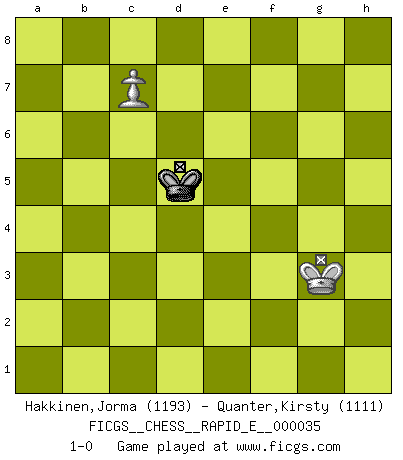 Last move : 1-0 2010 September 16 10:15:22 [Event "FICGS__CHESS__RAPID_E__000035"] [Site "FICGS"] [Date "2010.09.14"] [Round "1"] [White "Hakkinen,Jorma"] [Black "Quanter,Kirsty"] [Result "1-0"] [WhiteElo "1193"] [BlackElo "1111"] 1.d4 d6 2.c4 e5 3.dxe5 dxe5 4.Nc3 Nc6 5.Nf3 Bg4 6.Qxd8+ Rxd8 7.Bg5 Be7 8.Bxe7 Ngxe7 9.e3 Nb4 10.Rc1 Bf5 11.e4 Bg4 12.Be2 Bxf3 13.gxf3 f5 14.exf5 Nxf5 15.O-O Rd2 16.b3 Nd4 17.Kg2 Nxe2 18.Nxe2 Rxe2 19.a3 Nc2 20.Kg3 Nxa3 21.Ra1 Nc2 22.Rxa7 Nd4 23.Ra8+ Kf7 24.Rxh8 Nf5+ 25.Kh3 e4 26.fxe4 Rxe4 27.Rxh7 Kg8 28.Rh5 g6 29.Rg5 Rh4+ 30.Kg2 Kh7 31.f3 c5 32.Re1 Kh6 33.Rg4 Rh5 34.Rge4 Nh4+ 35.Kf2 Nf5 36.Kg1 Nh4 37.R1e3 Nf5 38.Rd3 Rg5+ 39.Rg4 Nd4 40.Rxg5 Kxg5 41.Kf2 Kf4 42.h4 Nf5 43.Rd5 b6 44.Rd8 Nxh4 45.Rd6 g5 46.Rxb6 Nxf3 47.Rc6 Nd2 48.Rxc5 Nxb3 49.Rc8 g4 50.Rf8+ Kg5 51.Kg3 Nd2 52.Rg8+ Kf5 53.c5 Ne4+ 54.Kh4 g3 55.c6 Kf4 56.Rg4+ Kf5 57.Rxe4 Kxe4 58.Kxg3 Kd5 59.c7 1-0 Old Indian defense Kingside Castling by player White (move 15) 10 pieces endgame at move 44 : White KRPPP , Black KNPPP WHITE : King + 1 Rook 3 Pawns BLACK : King + 1 Knight 3 Pawns 9 pieces endgame at move 46 : White KRPPP , Black KNPP WHITE : King + 1 Rook 3 Pawns BLACK : King + 1 Knight 2 Pawns 8 pieces endgame at move 46 : White KRPP , Black KNPP WHITE : King + 1 Rook 2 Pawns BLACK : King + 1 Knight 2 Pawns 7 pieces endgame at move 48 : White KRPP , Black KNP WHITE : King + 1 Rook 2 Pawns BLACK : King + 1 Knight 1 Pawn 6 pieces endgame at move 48 : White KRP , Black KNP WHITE : King + 1 Rook 1 Pawn BLACK : King + 1 Knight 1 Pawn 5 pieces endgame at move 57 : White KRP , Black KP WHITE : King + 1 Rook 1 Pawn BLACK : King + 1 Pawn 4 pieces endgame at move 57 : White KP , Black KP WHITE : King + 1 Pawn BLACK : King + 1 Pawn 3 pieces endgame at move 58 : White KP , Black K WHITE : King + 1 Pawn BLACK : King + Player White won this chess game. Follow this game move after move (download)The way he plays Chess demonstrates a man's whole nature. (Stanley Ellin) Ich kenne Menschen, die allen Willen der Welt besitzen und doch nicht Schach spielen können. (Robert James Fischer) Mis oponentes también hacen buenas movidas. A veces yo no tomo esas cosas en consideración. (Bobby Fischer) Comme les marins qui ont mille raisons différentes d'aller en mer, les joueurs d'échecs en ont tout autant avant de s'installer devant une table et jouer... (Vincent Bertignac, philosophe) I teach you to lie, cheat and steal, and as soon as my back's turned you wait in line ? (Gregory House, House M.D.)