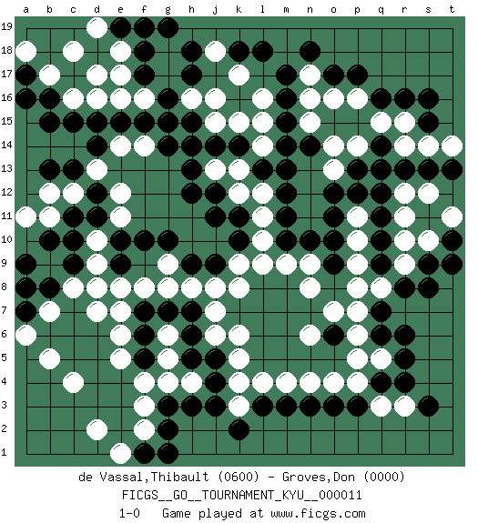 Last move : 1-0 2007 March 16 22:15:34 [Event "FICGS__GO__TOURNAMENT_KYU__000011"] [Site "FICGS"] [Date "2006.11.22"] [Round "1"] [Black "de Vassal,Thibault"] [White "Groves,Don"] [Result "1-0"] [Rating 1 "0600"] [Rating 2 "0000"] 1.q4 c4 2.q16 d17 3.c15 f16 4.h17 k17 5.d11 d7 6.h15 k3 7.g14 c16 8.d15 d16 9.m3 r10 10.m17 k15 11.m15 k13 12.r8 q13 13.f18 e18 14.c9 c8 15.m13 r15 16.r16 q15 17.k11 h16 18.g16 j16 19.g15 g17 20.f17 g18 21.h18 e16 22.h12 f3 23.m11 r3 24.r4 q3 25.p3 p4 26.o3 o4 27.s3 n4 28.n3 m4 29.q6 n8 30.s15 s14 31.s16 p16 32.p17 o16 33.o17 n16 34.m16 n17 35.n18 k8 36.o11 o13 37.b16 b17 38.b15 c18 39.h6 h8 40.f6 f8 41.j4 k4 42.j3 e5 43.f5 e6 44.g3 f4 45.k2 g4 46.l3 l4 47.j5 k6 48.g2 f2 49.f10 d9 50.c10 p9 51.o6 n6 52.q11 r11 53.q12 r12 54.j9 j8 55.h9 g9 56.g10 k9 57.k10 o7 58.q9 p6 59.q7 q5 60.r5 p5 61.q10 p8 62.s9 l12 63.m12 s10 64.t10 t11 65.f1 e1 66.g1 d2 67.p13 p14 68.p12 h4 69.f7 e8 70.t9 r9 71.s8 n15 72.n14 o14 73.r13 r14 74.s13 s12 75.t13 t14 76.q14 l10 77.q13 l11 78.k14 l14 79.j14 j13 80.h13 j15 81.h14 e14 82.e15 f14 83.f15 e11 84.e10 e12 85.d12 d13 86.c13 c12 87.c11 b12 88.b13 b11 89.b10 d10 90.b8 b7 91.a9 a11 92.l13 k12 93.j11 l15 94.d14 g6 95.g7 g5 96.h7 j6 97.h5 k5 98.a7 a6 99.a8 b5 100.m10 m9 101.j12 l9 102.o10 l16 103.m14 j18 104.l18 q8 105.k18 e7 106.e19 d19 107.f19 g8 108.h3 n9 109.a17 a18 110.a16 e17 111.g19 j7 112.e9 d8 113.n10 p7 114.r6 p10 115.o9 p11 116.o12 1-0 Here are the names of the openings (joseki) played in the four corners : Corner d16 : d17 c15 Komoku (Somok, Xiao~mu`) 3-4 Point. The komoku (3-4) point is the traditional corner enclosure move.. Ikken Kakari (Hankan Keolch'im, Yi Gua`jiao~, 1-Space Low Pincer). The small knight move is the basic approach move to the 3-4 point stone. It has been continually used for over four centuries. There are limitless variations, with new moves constantly being discovered. Black 2 opens the door to a treaure store of joseki. Player Black won this Go (weiqi, baduk) game. Follow this game move after move (download)Each step in a ladder is worth 7 points. (Anonymous) Statistics can be made to prove anything - even the truth. (Author unknown)