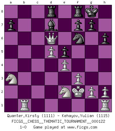 Last move : 1-0 2010 October 4 14:37:34 [Event "FICGS__CHESS__THEMATIC_TOURNAMENT__000122"] [Site "FICGS"] [Date "2010.09.15"] [Round "1"] [White "Quanter,Kirsty"] [Black "Kehayov,Yulian"] [Result "1-0"] [WhiteElo "1111"] [BlackElo "1115"] 1.e4 e6 2.b4 Bxb4 3.c3 Be7 4.a4 Nf6 5.f3 O-O 6.Ba3 Bxa3 7.Nxa3 e5 8.d4 d6 9.d5 c6 10.c4 Qa5+ 11.Kf2 Qxa4 12.Qxa4 cxd5 13.cxd5 Na6 14.Bxa6 bxa6 15.Rb1 Bd7 16.Qxa6 h6 17.Qxd6 Rad8 18.Ne2 1-0 French defense Kingside Castling by player Black (move 5) Player White won this chess game. Follow this game move after move (download)When you absolutely don't know what to do anymore, it is time to panic. (John van der Wiel) Capablanka war das größte Genie der Schachgeschichte! Aber denken sie nicht er habe nichts vom Schach verstanden. Er wusste nur soviel wie er wissen musste um seine Ziele zu erreichen. (Mikhail Moiseyevich Botvinik) La vida es como un juego de Ajedrez, cambiando con cada movimiento. (Proverbio Chino) Je ne crois pas en la psychologie, je crois aux bons coups. (Robert Fischer) The intuitive mind is a sacred gift; the rational mind is a faithful servant. We have created a society that honors the servant but has forgotten the gift. (Albert Einstein)