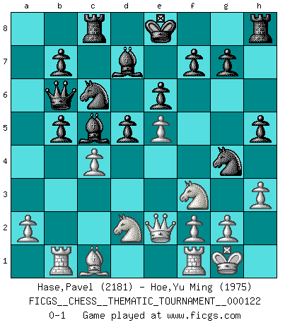 Last move : 0-1 2010 October 16 16:38:46 [Event "FICGS__CHESS__THEMATIC_TOURNAMENT__000122"] [Site "FICGS"] [Date "2010.09.15"] [Round "1"] [White "Hase,Pavel"] [Black "Hoe,Yu Ming"] [Result "0-1"] [WhiteElo "2181"] [BlackElo "1975"] 1.e4 e6 2.b4 Bxb4 3.c3 Be7 4.d4 c5 5.Nf3 d5 6.e5 Nc6 7.Be2 h5 8.O-O Nh6 9.dxc5 Ng4 10.Bb5 Bxc5 11.Nbd2 Qb6 12.Qe2 Bd7 13.Rb1 Rc8 14.c4 a6 15.h3 axb5 0-1 French defense Kingside Castling by player White (move 8) Player Black won this chess game. Follow this game move after move (download)When you are lonely, when you feel yourself an alien in the world, play Chess. This will raise your spirits and be your counselor in war. (Aristotle) Oft bringt ein stiller Zug das Erdbeben. (Richard Reti) Uno no tiene que jugar muy bien, es suficiente jugar mejor que el oponente. (Siegbert Tarrasch) Soyez une menace à chaque fois que vous vous asseyez pour jouer. (Ken Smith) Chess is everything: art, science and sport. (Anatoly Karpov)