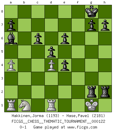 Last move : 0-1 2010 October 11 18:56:10 [Event "FICGS__CHESS__THEMATIC_TOURNAMENT__000122"] [Site "FICGS"] [Date "2010.09.15"] [Round "1"] [White "Hakkinen,Jorma"] [Black "Hase,Pavel"] [Result "0-1"] [WhiteElo "1193"] [BlackElo "2181"] 1.e4 e6 2.b4 Bxb4 3.c3 Be7 4.d4 c5 5.Nf3 Nf6 6.Bg5 Nxe4 7.Bxe7 Qxe7 8.Bd3 f5 9.O-O O-O 10.Re1 d5 11.Bxe4 fxe4 12.Ne5 Nc6 13.Nxc6 bxc6 14.dxc5 Qxc5 15.Qd4 Qxd4 16.cxd4 Rb8 17.a4 Rb2 18.Rf1 Ba6 19.Rc1 R8xf2 20.Rd1 Rxg2+ 21.Kh1 Rxh2+ 22.Kg1 Rbg2+ 0-1 French defense Kingside Castling by player White (move 9) Kingside Castling by player Black (move 9) Player Black won this chess game. Follow this game move after move (download)By playing at Chess then, we may learn: First: Foresight... Second: Circumspection... Third: Caution... And lastly, we learn by Chess the habit of not being discouraged by present bad appearances in the state of our affairs, the habit of hoping for a favorable chance, and that of persevering in the secrets of resources. (Benjamin Franklin) Schach ist die gewalttätigste aller Sportarten. (Garry Kasparov) El Ajedrez es un expediente tonto que hace creer a la gente inactiva que hacen una cosa muy astuta cuando solamente estan perdiendo su tiempo. (George Bernard Shaw) Si je n'étais pas joueur d'échecs, je serais le meilleur dans quelque chose d'autre. (Anatoli Karpov) A journey of a thousand sites begins with a single click. (Author unknown)