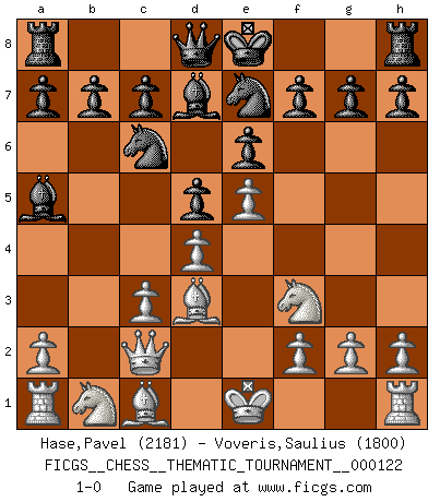 Last move : 1-0 2010 November 11 22:0:27 [Event "FICGS__CHESS__THEMATIC_TOURNAMENT__000122"] [Site "FICGS"] [Date "2010.09.15"] [Round "1"] [White "Hase,Pavel"] [Black "Voveris,Saulius"] [Result "1-0"] [WhiteElo "2181"] [BlackElo "1800"] 1.e4 e6 2.b4 Bxb4 3.c3 Ba5 4.d4 Nc6 5.Nf3 d5 6.e5 Bd7 7.Bd3 Nge7 8.Qc2 1-0 This chess game has been lost on time (started : 2010.09.15 16:4:19) French defense Player White won this chess game. Follow this game move after move (download)I look one move ahead... the best ! (Siegbert Tarrasch) Sicherlich können nur Meister einen Stil haben. Daß ein nicht-Meister auch nur ein einziges Mal in seinem Leben eine Partie folgerecht durchführte, habe ich niemals bemerkt. (Emanuel Lasker) Un entendimiento minucioso de las típicas continuaciones de mate hacen de las mas complicadas combinaciones de sacrificio que conducen hacia ellas no solo no dificiles, sino casi un asunto de rutina. (Siegbert Tarrasch) On est toujours la mazette de quelqu'un d'autre. (Anonyme) Convictions are more dangerous enemies of truth than lies. (Friedrich Nietzsche)