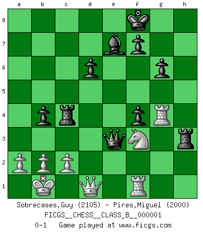 Last move : 0-1 2007 January 14 18:8:58 [Event "FICGS__CHESS__CLASS_B__000001"] [Site "FICGS"] [Date "2006.04.09"] [Round "1"] [White "Sobrecases,Guy"] [Black "Pires,Miguel"] [Result "0-1"] [WhiteElo "2105"] [BlackElo "2000"] 1.e4 c5 2.Nf3 d6 3.d4 cxd4 4.Nxd4 Nf6 5.Nc3 a6 6.Be3 e5 7.Nb3 Be6 8.Qd2 Nbd7 9.f3 b5 10.O-O-O Nb6 11.Bxb6 Qxb6 12.g4 Be7 13.h4 Rc8 14.Bd3 b4 15.Nd5 Nxd5 16.exd5 Bxd5 17.Bxa6 Qxa6 18.Qxd5 O-O 19.Kb1 Rc4 20.Nc1 Rfc8 21.Rh2 R8c5 22.Qd3 Qa8 23.Nb3 Rc7 24.Re2 h6 25.g5 Rxh4 26.gxh6 Rxh6 27.Rg1 Qc6 28.Nd2 Kf8 29.Re4 Qb6 30.Reg4 g6 31.f4 exf4 32.Nf3 Qe3 33.Qd1 Rh3 34.Rf1 Rc4 0-1 This chess game has been lost on time (started : 2006.04.09 0:24:26) Sicilian : Najdorf, Byrne (English) attack Queenside Castling by player White (move 10) Kingside Castling by player Black (move 18) Player Black won this chess game. Follow this game move after move (download)The sign of a great Master is his ability to win a won game quickly and painlessly. (Irving Chernev) Ein Schachgenie ist jemand der verdammt gut Schach spielt. (Jonathan Levitt) En un gambito tu regalas un Peón por el bién de tomar un juego perdido. (Samuel Standige Boden) Il n'y a pas de prix trop élevé au scalp de l'ennemi. (Koblentz) You know what they say : You lie down with the Devil, you wake up in Hell. (Horatio Caine, C.S.I. Miami)