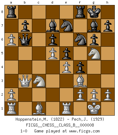 Last move : 1-0 2007 February 20 17:13:15 [Event "FICGS__CHESS__CLASS_B__000008"] [Site "FICGS"] [Date "2006.11.22"] [Round "1"] [White "Hoppenstein,Michael"] [Black "Pech,Jaroslav"] [Result "1-0"] [WhiteElo "1822"] [BlackElo "1929"] 1.d4 Nf6 2.c4 g6 3.Nc3 Bg7 4.Nf3 O-O 5.e4 d6 6.Be2 e5 7.O-O Nc6 8.d5 Ne7 9.b4 Nh5 10.Re1 f5 11.Ng5 Nf6 12.Bf3 c6 13.Be3 f4 14.Bc1 cxd5 15.cxd5 Qb6 16.b5 Bd7 17.Qb3 a6 18.bxa6 1-0 This chess game has been lost on time (started : 2006.11.22 10:24:43) King's Indian defense, 3.Nc3 Kingside Castling by player Black (move 4) Kingside Castling by player White (move 7) Player White won this chess game. Follow this game move after move (download)The beauty of a move lies not in its' appearance but in the thought behind it. (Siegbert Tarrasch) Ich habe kein Problem mit Frauen, sondern nur mit dem Niveau ihres Schachspiels (Judith Polgar) Fischer sacrificó virtualmente todo lo que la mayoría de nosotros los 'debiles' (término que él usa) valoramos, respetamos y apreciamos por el amor de un astuto, a menudo hermoso tablero de juego, por el privilegio ambivalente de ser su mas grande maestro. (Paul Kollar) Seul un grand joueur sait à quel point il joue faiblement. (Xavier Tartacover) Never risk one's whole fortune unless supported by one's entire army. (Niccolo Machiavelli)