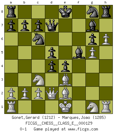 Last move : 0-1 2010 October 9 13:21:26 [Event "FICGS__CHESS__CLASS_E__000129"] [Site "FICGS"] [Date "2010.09.15"] [Round "1"] [White "Gonet,Gerard"] [Black "Marques,Joao"] [Result "0-1"] [WhiteElo "1212"] [BlackElo "1285"] 1.f4 f5 2.e4 fxe4 3.Nc3 Nf6 4.g4 h6 5.g5 hxg5 6.fxg5 Ng8 7.Be2 g6 8.h4 d5 9.h5 Bf5 10.d3 Nc6 11.Be3 Bg7 12.d4 Qd7 13.h6 e5 14.Qd2 exd4 0-1 Bird's Opening, Swiss gambit Player Black won this chess game. Follow this game move after move (download)It is no time to be playing Chess when the house is on fire. (Italian Proverb) Ich hatte Zahnschmerzen im ersten Spiel. In der zweiten Partie tat mir der Kopf weh. In der dritten war es eine Rheuma-Attacke und während der vierten fühlte ich mich nicht gut. Und in der fünften? Nun, man muss doch nicht jedes Spiel gewinnen, oder? (Savielly Grigorievitsch Tartakower) No hay precio que sea tan grande por la cabellera del Rey enemigo. (Koblentz) Le génie consiste à savoir transgresser les règles au moment opportun. (Teichmann) Industry executives and analysts often mistakenly talk about strategy as if it were some kind of chess match. But in chess, you have just two opponents, each with identical resources, and with luck playing a minimal role. The real world is much more like a poker game, with multiple players trying to make the best of whatever hand fortune has dealt them. In our industry, Bill Gates owns the table until someone proves otherwise. (David Moschella, 'Computerworld')