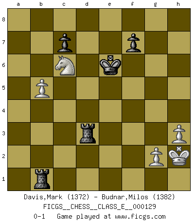 Last move : 0-1 2011 February 4 16:12:6 [Event "FICGS__CHESS__CLASS_E__000129"] [Site "FICGS"] [Date "2010.09.15"] [Round "1"] [White "Davis,Mark"] [Black "Budnar,Milos"] [Result "0-1"] [WhiteElo "1372"] [BlackElo "1382"] 1.e4 e5 2.Nf3 Nc6 3.Nc3 Nf6 4.d3 Bb4 5.Bg5 h6 6.Bd2 d6 7.Be2 Bg4 8.O-O O-O 9.a3 Ba5 10.h3 Bh5 11.b4 Bb6 12.Nd5 Bg6 13.Nxb6 axb6 14.c3 Ne7 15.Qb3 b5 16.Nh4 Bh7 17.f4 exf4 18.Bxf4 g5 19.Bxg5 hxg5 20.Nf3 d5 21.Nxg5 Qd6 22.Rad1 Bg6 23.exd5 Qxd5 24.Qxd5 Nfxd5 25.c4 Ne3 26.cxb5 Nxf1 27.Bxf1 Rxa3 28.Ne4 Rb3 29.Nc5 Rxb4 30.d4 Rd8 31.Nxb7 Rd8xd4 32.Re1 Kf8 33.Na5 Bd3 34.Bxd3 Rxd3 35.Rxe7 Rb1+ 36.Kh2 Kxe7 37.Nc6+ Ke6 0-1 Four knights game Kingside Castling by player White (move 8) Kingside Castling by player Black (move 8) 10 pieces endgame at move 36 : White KNPPP , Black KRRPP WHITE : King + 1 Knight 3 Pawns BLACK : King + 2 Rooks 2 Pawns Player Black won this chess game. Follow this game move after move (download)In order to improve your game, you must study the endgame before everything else, for whereas the endings can be studied and mastered by themselves, the middle game and the opening must be studied in relation to the endgame. (Jose Raul Capablanca) Sicherlich können nur Meister einen Stil haben. Daß ein nicht-Meister auch nur ein einziges Mal in seinem Leben eine Partie folgerecht durchführte, habe ich niemals bemerkt. (Emanuel Lasker) Un entendimiento minucioso de las típicas continuaciones de mate hacen de las mas complicadas combinaciones de sacrificio que conducen hacia ellas no solo no dificiles, sino casi un asunto de rutina. (Siegbert Tarrasch) Il (Jacob Murray) ne joue pas pour le bon coup, mais pour le meilleur. (Eloi Relange) He who is a good ruler must first have been ruled. (Aristotle)