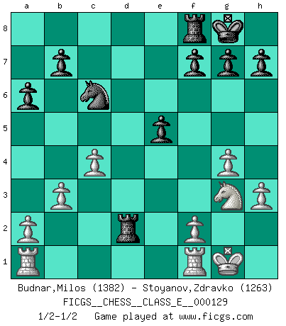 Last move : 1/2-1/2 2010 September 28 22:9:20 [Event "FICGS__CHESS__CLASS_E__000129"] [Site "FICGS"] [Date "2010.09.15"] [Round "1"] [White "Budnar,Milos"] [Black "Stoyanov,Zdravko"] [Result "1/2-1/2"] [WhiteElo "1382"] [BlackElo "1263"] 1.e4 c5 2.Nf3 a6 3.c4 d6 4.d4 Nf6 5.Bd3 Bg4 6.Be3 cxd4 7.Bxd4 e5 8.Bc3 Be7 9.h3 Bh5 10.O-O O-O 11.g4 Bg6 12.Nh4 Bxe4 13.Bxe4 Nxe4 14.Nf5 Nxc3 15.Nxc3 Nc6 16.Ne4 Rc8 17.Nxe7+ Qxe7 18.Qxd6 Qh4 19.Qd3 Rcd8 20.Qg3 Qxg3+ 21.Nxg3 Rd2 22.b3 1/2-1/2 Sicilian : O'Kelly variation Kingside Castling by player White (move 10) Kingside Castling by player Black (move 10) This chess game ended in a draw. Follow this game move after move (download)I play correspondence chess because it is both art and science while chess is art only. (A player at FICGS) Ich spiele 70 Eröffnungssysteme. (Viktor Kortschnoi) Ciertamente el estado mental actual de Bobby Fischer es una tragedia. Uno de los mas grandes jugadores de Ajedrez del mundo -el orgullo y pena del Ajedrez Americano. (Frank Brady) Si rien de grave n'est détecté lors de l'analyse d'une position, on joue alors le coup. Seconde règle de Blumenfeld. It is a good thing for an uneducated man to read books of quotations. (Winston Churchill)