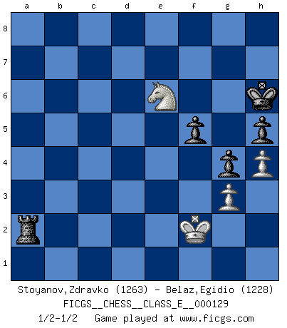 Last move : 1/2-1/2 2010 November 20 20:16:24 [Event "FICGS__CHESS__CLASS_E__000129"] [Site "FICGS"] [Date "2010.09.15"] [Round "1"] [White "Stoyanov,Zdravko"] [Black "Belaz,Egidio"] [Result "1/2-1/2"] [WhiteElo "1263"] [BlackElo "1228"] 1.e4 c5 2.Nf3 d6 3.h3 Nc6 4.Bb5 e5 5.Bxc6+ bxc6 6.d3 Nf6 7.Bg5 Be7 8.Bxf6 Bxf6 9.O-O O-O 10.Nbd2 Qb6 11.Nc4 Qc7 12.a3 d5 13.exd5 cxd5 14.Ncd2 Ba6 15.c3 Bxd3 16.Re1 c4 17.Kh2 d4 18.cxd4 exd4 19.Kg1 c3 20.bxc3 Qxc3 21.Ne4 Bxe4 22.Rxe4 Rad8 23.a4 Qc6 24.Re1 d3 25.Ra2 Qc4 26.Rd2 Bc3 27.Ne5 Qa6 28.Rxd3 Rxd3 29.Nxd3 Bxe1 30.Nxe1 h6 31.Nf3 Qb6 32.Ne5 Re8 33.Qh5 Qc7 34.Nd3 Rd8 35.Ne5 Rd5 36.f4 Kh7 37.Qe2 Qc1+ 38.Kh2 Qxf4+ 39.g3 Qd2 40.Qxd2 Rxd2+ 41.Kg1 f6 42.Nc6 a6 43.Nb4 Rd1+ 44.Kf2 Ra1 45.Nxa6 Rxa4 46.Nc5 Ra2+ 47.Kf3 g5 48.Kg4 Kg6 49.h4 Ra3 50.Ne6 h5+ 51.Kh3 g4+ 52.Kg2 f5 53.Nf4+ Kh6 54.Ne6 Ra2+ 55.Kf1 Ra1+ 56.Kf2 Kg6 57.Nf4+ Kh6 58.Ne6 Ra2+ 1/2-1/2 Sicilian Kingside Castling by player White (move 9) Kingside Castling by player Black (move 9) 10 pieces endgame at move 45 : White KNPPP , Black KRPPP WHITE : King + 1 Knight 3 Pawns BLACK : King + 1 Rook 3 Pawns 9 pieces endgame at move 45 : White KNPP , Black KRPPP WHITE : King + 1 Knight 2 Pawns BLACK : King + 1 Rook 3 Pawns This chess game ended in a draw. Follow this game move after move (download)First-class players lose to second-class players because second-class players sometimes play a first-class game. (Siegbert Tarrasch) Die Auseinandersetzung mit Karpow war politisch geprägt. Er stand für das kommunistische System, wurde von dessen Repräsentanten gehätschelt. Ich war der Oppositionelle. Jeder Schachweltmeister spiegelt auch die gesellschaftlichen Verhältnisse wider. Kramnik steht für die Börsen-Generation des Neuen Markts, ideologiefrei, zahlenfixiert. (Garry Kasparov) Cuando estes solo, cuando te sientas un extraño en el mundo, juega al Ajedrez. Esto levantará tu espiritu y será tu consejero de guerra. (Aristóteles) Les Echecs mettent en conflit, non pas deux intelligences, mais deux volontés. (Lasker) Work expands to fill the time available. (C. Northcote Parkinson, in Parkinson's Laws)
