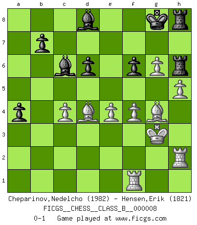 Last move : 0-1 2007 May 23 16:43:52 [Event "FICGS__CHESS__CLASS_B__000008"] [Site "FICGS"] [Date "2006.11.22"] [Round "1"] [White "Cheparinov,Nedelcho"] [Black "Hensen,Erik"] [Result "0-1"] [WhiteElo "1982"] [BlackElo "1821"] 1.e4 c5 2.Nf3 d6 3.d4 cxd4 4.Nxd4 Nf6 5.Nc3 a6 6.Be3 e6 7.g4 h6 8.Bg2 Nc6 9.h3 Ne5 10.f4 Nc4 11.Bc1 Qb6 12.b3 e5 13.bxc4 exd4 14.Rb1 Qc5 15.Na4 Qa5+ 16.c3 Rb8 17.O-O dxc3 18.Be3 Bd7 19.Nb6 Bc6 20.Qd3 h5 21.g5 Nd7 22.Bd4 Nc5 23.Qc2 Qa3 24.Bxc3 Be7 25.Bxg7 Rg8 26.Bc3 Na4 27.Bd4 Nxb6 28.Rxb6 Rc8 29.Qe2 h4 30.Re1 Kf8 31.Qg4 Rc7 32.Qxh4 Qxa2 33.Bf1 Qd2 34.Qf2 Qxf2+ 35.Kxf2 Bd8 36.Rb2 a5 37.h4 f6 38.Kg3 Ke8 39.Be2 Rh7 40.Bg4 Rgh8 41.Rh2 Kf7 42.Bf5 Rh5 43.Rf1 a4 44.Bg4 R5h7 45.h5 Kg8 46.g6 Rh6 0-1 Sicilian : Najdorf, Byrne (English) attack Kingside Castling by player White (move 17) Player Black won this chess game. Follow this game move after move (download)I love all positions. Give me a difficult positional game, I will play it. But totally won positions, I cannot stand them. (Hein Donner) Ich kenne keine einzige Person, die behaupten würde, Garri Kasparow sei ein guter Mensch (Nigel Short) La captura del Rey enemigo es la finalidad pero no el primer objetivo de la partida. (William Steinitz) Ce qui est bien, c'est d'avoir tout un tas de pièces en prise : l'adversaire ne peut en prendre qu'une à la fois. Cité par Thierry Audin. The question of whether computers can think is just like question of whether submarines can swim. (Edsger W. Dijkstra)