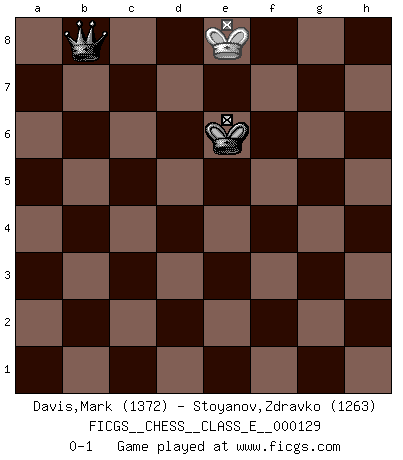 Last move : 0-1 2011 April 18 14:4:42 [Event "FICGS__CHESS__CLASS_E__000129"] [Site "FICGS"] [Date "2010.09.15"] [Round "1"] [White "Davis,Mark"] [Black "Stoyanov,Zdravko"] [Result "0-1"] [WhiteElo "1372"] [BlackElo "1263"] 1.e4 c5 2.Nf3 a6 3.b3 Nc6 4.Bb2 e5 5.Bc4 d6 6.O-O h6 7.Re1 Bg4 8.Nc3 Nd4 9.h3 Nxf3+ 10.gxf3 Bxh3 11.Ne2 Qg5+ 12.Ng3 Nf6 13.Kh2 Qh4 14.Bf1 Bxf1 15.Kg1 Bb5 16.c4 Bd7 17.Kf1 b5 18.Ke2 bxc4 19.Rh1 Qf4 20.Rg1 Bb5 21.Bc1 cxb3 22.d3 Qh4 23.axb3 Qh3 24.Nf5 g5 25.Rh1 Qg2 26.Be3 Nxe4 27.fxe4 Qg4+ 28.Kd2 Qxd1+ 29.Raxd1 O-O-O 30.Rc1 Kb7 31.Rc3 f6 32.f3 Be8 33.Kc2 Bg6 34.Ng3 Be7 35.Ne2 Kc6 36.Nc1 Kb5 37.Na2 f5 38.Rc4 f4 39.Bd2 Bf7 40.Nc3+ Kb6 41.Ra4 Be8 42.Ra3 h5 43.Nd5+ Kb7 44.Nxe7 Bb5 45.Ba5 Rd7 46.Nd5 Rdh7 47.b4 c4 48.dxc4 Bxc4 49.Rc3 Bxd5 50.exd5 g4 51.fxg4 hxg4 52.Rxh7+ Rxh7 53.Rc6 g3 54.Rxd6 g2 55.Rg6 f3 56.Bb6 Rh2 57.Bf2 g1Q 58.Rxg1 Rxf2+ 59.Kd3 Re2 60.Rf1 Rb2 61.Kc3 Rh2 62.Kd3 Kc7 63.Rxf3 Rh4 64.Re3 Rd4+ 65.Kc3 Rxd5 66.Kc4 Kc6 67.Rh3 Rd4+ 68.Kc3 Rf4 69.Re3 Kd5 70.Rd3+ Rd4 71.Re3 Rc4+ 72.Kb3 Kd4 73.Rh3 e4 74.Ka3 e3 75.Kb3 Rc3+ 76.Ka4 Kd3 77.Ka5 Ra3+ 78.Kb6 Kd2 79.Kc5 Ra2 80.Kd4 e2 81.Rh2 Kd1 82.Rh1+ e1Q 83.Rxe1+ Kxe1 84.Kc5 Kd2 85.Kb6 Kc3 86.Kc5 Ra4 87.b5 a5 88.b6 Rb4 89.Kc6 a4 90.b7 a3 91.Kc7 a2 92.b8Q Rxb8 93.Kxb8 a1Q 94.Kc7 Kc4 95.Kd6 Qa5 96.Kc6 Qa6+ 97.Kd7 Kc5 98.Ke7 Kd5 99.Kf7 Ke5 100.Ke8 Qa7 101.Kd8 Ke6 102.Ke8 Qb8+ 0-1 Sicilian : O'Kelly variation Kingside Castling by player White (move 6) Queenside Castling by player Black (move 29) Promotion Queen by player Black (move 57) 10 pieces endgame at move 58 : White KRBPP , Black KRPPP WHITE : King + 1 Rook 1 Bishop 2 Pawns BLACK : King + 1 Rook 3 Pawns 9 pieces endgame at move 58 : White KRPP , Black KRPPP WHITE : King + 1 Rook 2 Pawns BLACK : King + 1 Rook 3 Pawns 8 pieces endgame at move 63 : White KRPP , Black KRPP WHITE : King + 1 Rook 2 Pawns BLACK : King + 1 Rook 2 Pawns 7 pieces endgame at move 65 : White KRP , Black KRPP WHITE : King + 1 Rook 1 Pawn BLACK : King + 1 Rook 2 Pawns Promotion Queen by player Black (move 82) 6 pieces endgame at move 83 : White KRP , Black KRP WHITE : King + 1 Rook 1 Pawn BLACK : King + 1 Rook 1 Pawn 5 pieces endgame at move 83 : White KP , Black KRP WHITE : King + 1 Pawn BLACK : King + 1 Rook 1 Pawn Promotion Queen by player White (move 92) 4 pieces endgame at move 92 : White K , Black KRP WHITE : King + BLACK : King + 1 Rook 1 Pawn 3 pieces endgame at move 93 : White K , Black KP WHITE : King + BLACK : King + 1 Pawn Promotion Queen by player Black (move 93) Player Black won this chess game. Follow this game move after move (download)Chess makes man wiser and clear-sighted. (Vladimir Putin) Ich hatte meine größten Erfolge, als ich 47 Jahre alt war. Kasparow war noch nicht mal 42 und hat das Schach schon im Stich gelassen. (Viktor Kortschnoi) Los asuntos humanos son como una partida de Ajedrez: solo aquellos que no lo toman seriamente, pueden ser llamados buenos jugadores. (Hung Tzu Ch'eng) Si je n'étais pas joueur d'échecs, je serais le meilleur dans quelque chose d'autre. (Anatoli Karpov) The Internet is the first thing that humanity has build that humanity doesn't understand, the largest experiment in anarchy that we have ever had. (Eric Schmidt)