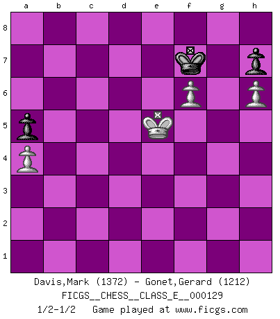 Last move : 1/2-1/2 2011 February 8 5:40:51 [Event "FICGS__CHESS__CLASS_E__000129"] [Site "FICGS"] [Date "2010.09.15"] [Round "1"] [White "Davis,Mark"] [Black "Gonet,Gerard"] [Result "1/2-1/2"] [WhiteElo "1372"] [BlackElo "1212"] 1.e4 Nc6 2.Nf3 Nf6 3.b3 Nxe4 4.Bb2 d6 5.d3 Nf6 6.Be2 e5 7.O-O Be7 8.Nc3 Bf5 9.Rc1 Qd7 10.Re1 O-O-O 11.a3 d5 12.Nh4 Bg6 13.Nf3 e4 14.dxe4 dxe4 15.Qxd7+ Rxd7 16.Nh4 a6 17.g3 Nd4 18.Bf1 Ng4 19.Kg2 Bxh4 20.gxh4 Re8 21.Ne2 Nf3 22.h3 Nh6 23.Red1 Rxd1 24.Rxd1 Nf5 25.Ng3 N5xh4+ 26.Kh1 f6 27.Bg2 Bh5 28.Nxh5 Nxg2 29.Kxg2 Rd8 30.Rxd8+ Kxd8 31.Nxg7 Ke7 32.Nf5+ Ke6 33.Nd4+ Nxd4 34.Bxd4 Kd5 35.Bxf6 b5 36.c4+ bxc4 37.bxc4+ Kxc4 38.h4 Kb3 39.Be7 Kc4 40.Kg3 Kd5 41.Kf4 c5 42.Bxc5 Kxc5 43.Kxe4 Kd6 44.Kf5 Ke7 45.h5 Kf7 46.h6 a5 47.a4 Ke7 48.f4 Kf7 49.Ke5 Kg6 50.f5+ Kf7 51.f6 Kf8 52.Ke6 Ke8 53.Kf5 Kf7 54.Ke5 Kf8 55.Kf5 Kf7 56.Ke5 1/2-1/2 KP : Nimzovich defense Kingside Castling by player White (move 7) Queenside Castling by player Black (move 10) 10 pieces endgame at move 37 : White KBPPP , Black KPPPP WHITE : King + 1 Bishop 3 Pawns BLACK : King + 4 Pawns 9 pieces endgame at move 42 : White KBPPP , Black KPPP WHITE : King + 1 Bishop 3 Pawns BLACK : King + 3 Pawns 8 pieces endgame at move 42 : White KPPP , Black KPPP WHITE : King + 3 Pawns BLACK : King + 3 Pawns 7 pieces endgame at move 43 : White KPPP , Black KPP WHITE : King + 3 Pawns BLACK : King + 2 Pawns This chess game ended in a draw. Follow this game move after move (download)Good offense and good defense both begin with good development. (Bruce A. Moon) Schach ist ein Kampf gegen den Fehler. (Johannes Herrman Zukertort) Botvinnik trató de alejar el misterio referente al Ajedrez, siempre relacionandolo a situaciones de la vida diaria. Solía llamar al Ajedrez un problema inexacto típico, similar a aquellos en que la gente tiene siempre que resolver a cada día. (Garry Kasparov) Une platitude souvent récitée à propos des Echecs est qu'une des choses les plus difficiles à réaliser est de gagner une position gagnante. Cela ne manque pas de sens mais, pour ma part, j'ai toujours trouvé plus difficile de gagner une position perdante. (Tim Krabbe) Luck is when opportunity knocks and you answer. (Anonymous)