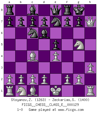 Last move : 1-0 2010 September 17 15:45:16 [Event "FICGS__CHESS__CLASS_E__000129"] [Site "FICGS"] [Date "2010.09.15"] [Round "1"] [White "Stoyanov,Zdravko"] [Black "Zeckarias,Simon"] [Result "1-0"] [WhiteElo "1263"] [BlackElo "1400"] 1.e4 e5 2.Nf3 Bd6 3.h3 Ne7 4.Bc4 Nbc6 5.Ng5 O-O 6.Qh5 Qe8 7.Qxh7+ 1-0 King's knight Opening Kingside Castling by player Black (move 5) Player White won this chess game. Follow this game move after move (download)Strategy requires thought, tactics require observation. (Max Euwe) Über die Verhaftung Bobby Fischers: Warum es die Bush-Administration für nötig befindet einen 61 Jahre alten Mann zu hetzten, der für niemanden ausser sich selbste eine Gefahr darstellt ist ein Rätsel. (Nigel Short) El Ajedrez es un invernadero donde los frutos del carácter pueden madurar mas completamente que en la vida. (Edward Morgan Foster) Dieu déplace le joueur, et celui-ci la pièce. Quel Dieu derrière Dieu commence donc la trame ? Arturo Perez-Reverte (prix de littérature policière 1993). In every real man a child is hidden that wants to play. (Friedrich Nietzsche)