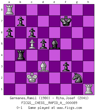 Last move : 0-1 2010 October 6 13:44:18 [Event "FICGS__CHESS__RAPID_A__000089"] [Site "FICGS"] [Date "2010.09.16"] [Round "1"] [White "Germanes,Ramil"] [Black "Riha,Josef"] [Result "0-1"] [WhiteElo "1980"] [BlackElo "2041"] 1.d4 d5 2.Nf3 Nf6 3.g3 Bg4 4.Bg2 e6 5.c4 c6 6.Qb3 Qb6 7.Nc3 Nbd7 8.c5 Qxb3 9.axb3 Bxf3 10.Bxf3 e5 11.e3 a6 12.O-O g6 13.Be2 Bg7 14.b4 O-O 15.Rd1 Rfe8 16.Bd3 exd4 17.exd4 Nf8 18.Bc2 Ne6 19.Kg2 Nh5 20.g4 Nhf4+ 21.Kf3 g5 22.Be3 Ng6 23.Ne2 Rf8 24.Kg3 h6 25.Ra3 Rae8 26.h3 Re7 27.Rd2 Nh4 28.Bf5 Bh8 29.f3 Ng7 30.Bb1 Rfe8 31.Kf2 f5 32.f4 h5 33.gxh5 Nxh5 34.Rd1 Nxf4 35.Nxf4 gxf4 36.Bxf4 Re2+ 37.Kf1 Bxd4 38.Bg3 Bxb2 39.Rb3 Bf6 40.Kg1 Rg2+ 41.Kh1 R8e2 42.Rg1 Rxg3 43.Rbxg3+ Kf7 44.Rf1 Be5 45.Rg5 Rh2+ 46.Kg1 Rxh3 47.Kf2 Kf6 48.Rg8 Rb3 49.Ke2 Rb2+ 50.Kd3 Rxb4 51.Kd2 Kf7 52.Ra8 f4 53.Bd3 Rb2+ 54.Kc1 f3 55.Rh1 Rb4 56.Kc2 Ng2 0-1 Queen's pawn game Kingside Castling by player White (move 12) Kingside Castling by player Black (move 14) Player Black won this chess game. Follow this game move after move (download)Chess is a terrific way for kids to build self image and self esteem. (Saudin Robovic) Pläne sind die Träume des Verständigen. (Ernst Freiherr von Feuchtersleben) En la perfecta combinación de Ajedrez como en una historia corta de primera clase, toda la trama y contra trama deberá conducir hacia un final sorprendente, el interes no es mitigado hasta el último momento. (Yates and Winter) Ce qui est bien, c'est d'avoir tout un tas de pièces en prise : l'adversaire ne peut en prendre qu'une à la fois. Cité par Thierry Audin. Hello Thibault, if I have had a plan (and I had one, I hope), I have forgotten it during the last week... - Hello Heinz-Georg. What do you mean a plan ? (Anonymous players, during a Big Chess game)