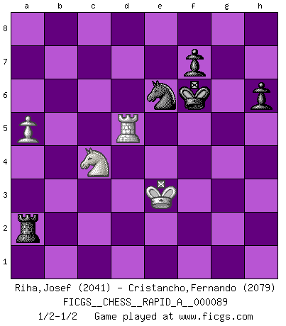Last move : 1/2-1/2 2010 October 6 15:28:9 [Event "FICGS__CHESS__RAPID_A__000089"] [Site "FICGS"] [Date "2010.09.16"] [Round "1"] [White "Riha,Josef"] [Black "Cristancho,Fernando"] [Result "1/2-1/2"] [WhiteElo "2041"] [BlackElo "2079"] 1.e4 c5 2.Nf3 d6 3.d4 cxd4 4.Nxd4 Nf6 5.f3 e5 6.Bb5+ Nbd7 7.Nf5 d5 8.exd5 a6 9.Ba4 b5 10.Bb3 a5 11.c3 Nb6 12.Qd3 a4 13.Bc2 Qxd5 14.Qe2 Bxf5 15.Bxf5 Be7 16.Bg5 Rd8 17.O-O O-O 18.Re1 Nc4 19.b3 Nd6 20.Bc2 e4 21.Bf4 exf3 22.Qxf3 Qxf3 23.gxf3 Nd5 24.bxa4 Nxf4 25.Rxe7 bxa4 26.Bxa4 g6 27.Bc2 Rfe8 28.Rxe8+ Rxe8 29.Na3 Re2 30.Rd1 Nc4 31.Nxc4 Rg2+ 32.Kf1 Rxc2 33.Rd8+ Kg7 34.Rd4 g5 35.h4 Ne6 36.Re4 Rxc3 37.a4 Rxf3+ 38.Ke2 Rg3 39.hxg5 Rxg5 40.a5 h6 41.Re5 Rg2+ 42.Ke3 Ra2 43.Rb5 Kf6 44.Rd5 1/2-1/2 Sicilian : Prins variation, Venice attack Kingside Castling by player White (move 17) Kingside Castling by player Black (move 17) 10 pieces endgame at move 39 : White KRNPP , Black KRNPP WHITE : King + 1 Rook 1 Knight 2 Pawns BLACK : King + 1 Rook 1 Knight 2 Pawns 9 pieces endgame at move 39 : White KRNP , Black KRNPP WHITE : King + 1 Rook 1 Knight 1 Pawn BLACK : King + 1 Rook 1 Knight 2 Pawns This chess game ended in a draw. Follow this game move after move (download)When you absolutely don't know what to do anymore, it is time to panic. (John van der Wiel) Der Vorposten provoziert a) eine Basis für neue Angriffe und b) eine Schwächung der gegnerischen Widerstandskraft in der fraglichen Linie. (Aaron Nimzowitsch) Los Peones son el alma de una partida de Ajedrez. (Francois Andre Danican Philidor) Il n'y a plus de joueurs du niveau de Jacob Murray dont la seule quête est le beau jeu, le plaisir de voir les pièces construire quelque chose. Sur 10 idées à la minute, 9 seront sans intérêt, la dernière s'avèrera géniale. (Christian Bauer) No enterprise is more likely to succeed than one concealed from the enemy until it is ripe for execution. (Niccolo Machiavelli)