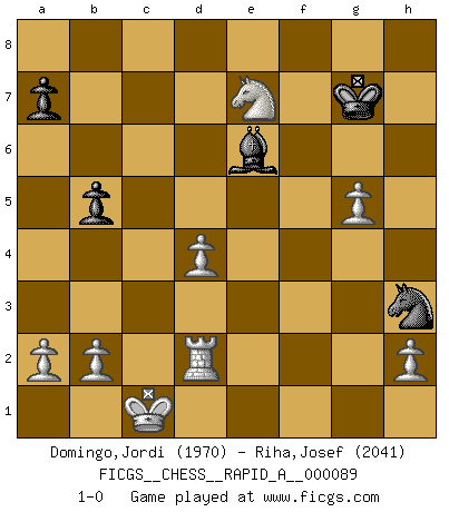 Last move : 1-0 2010 October 17 12:17:8 [Event "FICGS__CHESS__RAPID_A__000089"] [Site "FICGS"] [Date "2010.09.16"] [Round "1"] [White "Domingo,Jordi"] [Black "Riha,Josef"] [Result "1-0"] [WhiteElo "1970"] [BlackElo "2041"] 1.e4 g6 2.d4 Bg7 3.Nc3 d6 4.f4 Nf6 5.Nf3 O-O 6.Bd3 Nbd7 7.e5 Ne8 8.Ng5 h6 9.Nxf7 Kxf7 10.e6+ Kg8 11.Bxg6 Ndf6 12.f5 d5 13.Qf3 b5 14.Qh3 c5 15.Bxh6 cxd4 16.Ne2 d3 17.cxd3 Qb6 18.g4 Qd6 19.O-O-O Qe5 20.g5 Ng4 21.Bf7+ Rxf7 22.exf7+ Kxf7 23.Qh5+ Kf8 24.Bxg7+ Kxg7 25.Qxe8 Bxf5 26.Qxa8 Nf2 27.Nc3 Nxh1 28.Qxd5 Qxd5 29.Nxd5 Nf2 30.Nxe7 Be6 31.Rd2 Nh3 32.d4 1-0 Robatsch defense : Pseudo-Austrian attack Kingside Castling by player Black (move 5) Queenside Castling by player White (move 19) Player White won this chess game. Follow this game move after move (download)Could we look into the head of a Chess player, we should see there a whole world of feelings, images, ideas, emotion and passion. (Alfred Binet) Die größte Kunst beim Schach besteht darin dem Gegner nicht zu zeigen was er tun kann. (Garry Kasparov) Las piezas de Ajedrez son los bloques del alfabeto que moldean los pensamientos; y esos pensamientos, aunque hagan un diseño visual en el tablero, expresan abstractamente su belleza como un poema. (Marcel Duchamp) Un millionnaire : 'Monsieur Steinitz ! Vous ne participez aux tournois que pour l'argent, alors que moi je n'y viens que pour l'honneur.' Steinitz : 'Chacun joue pour ce qu'il n'a pas'... We cannot be sure of having something to live for unless we are willing to die for it. (Ernesto Che Guevara)