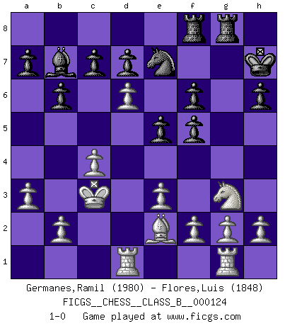 Last move : 1-0 2010 November 4 1:11:22 [Event "FICGS__CHESS__CLASS_B__000124"] [Site "FICGS"] [Date "2010.09.16"] [Round "1"] [White "Germanes,Ramil"] [Black "Flores,Luis"] [Result "1-0"] [WhiteElo "1980"] [BlackElo "1848"] 1.d4 Nf6 2.c4 e6 3.Nc3 Bb4 4.Qc2 O-O 5.a3 Bxc3+ 6.Qxc3 b6 7.Bg5 Ba6 8.Qf3 Nc6 9.e3 h6 10.Bxf6 Qxf6 11.Qxf6 gxf6 12.Rc1 f5 13.Ne2 Kg7 14.Nf4 Rg8 15.Nh5+ Kg6 16.Be2 Ne7 17.Rg1 f6 18.Nf4+ Kg7 19.Kd2 Rac8 20.Bh5 Kh7 21.Kc3 Bb7 22.Rcd1 Rcd8 23.Be2 Nc8 24.d5 e5 25.Nh5 Rdf8 26.Ng3 Ne7 27.d6 1-0 Nimzo-Indian : Classical variation Kingside Castling by player Black (move 4) Player White won this chess game. Follow this game move after move (download)The Chess pieces are the block alphabet which shapes thoughts; and these thoughts, although making a visual design on the chessboard, express their beauty abstractly, like a poem. (Marcel Duchamp) Karpov ist ein Museumsstück. (Garry Kasparov) Una compensación adecuada por un sacrificio es tener una combinación sólida que conduce a una posición ganadora; una compensación adecuada por una metida de pata es dejar a tu oponente arrebatar una derrota de las fauces de la victoria. (Bruce A. Moon) Les échecs, c'est l'art d'analyser. (Mikhail Botvinnik) Chess, like love, like music, has the power to make people happy. (Siegbert Tarrasch)