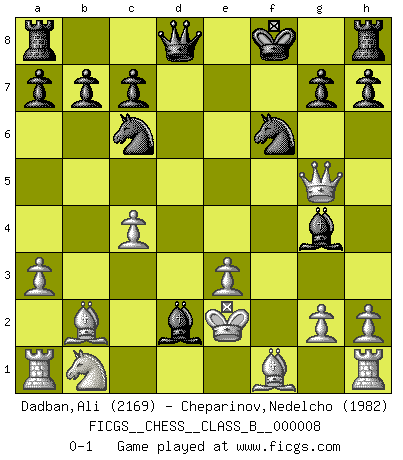 Last move : 0-1 2006 December 2 9:16:20 [Event "FICGS__CHESS__CLASS_B__000008"] [Site "FICGS"] [Date "2006.11.22"] [Round "1"] [White "Dadban,Ali"] [Black "Cheparinov,Nedelcho"] [Result "0-1"] [WhiteElo "2169"] [BlackElo "1982"] 1.Nf3 d5 2.c4 d4 3.b4 f6 4.Bb2 e5 5.e3 dxe3 6.fxe3 Bxb4 7.Nxe5 fxe5 8.Qh5+ Kf8 9.Qxe5 Nf6 10.a3 Nc6 11.Qg5 Bxd2+ 12.Ke2 Bg4+ 0-1 Reti : Advance variation Player Black won this chess game. Follow this game move after move (download)Chess is war over the board. The object is to crush the opponents mind. (Bobby Fischer) Das Blackmar-Diemer-Gambit verändert den ganzen Menschen! (Emil Joseph Diemer) Yo considero que Fischer es uno de los expertos mas grandes de aperturas de siempre. (Keith Hayward) À la honte des hommes, on sait que les lois du jeu sont les seules qui soient partout justes, claires, inviolables et exécutées. Pourquoi l'Indien qui a donné les règles du jeu d'échecs est-il obéi de bon gré dans toute la terre, et que les décrétales des papes, par exemple, sont aujourd'hui un objet d'horreur et de mépris ? C'est que l'inventeur des échecs combina tout avec justesse pour la satisfaction des joueurs, et que les papes, dans leurs décrétales, n'eurent en vue que leur seul avantage. L'Indien voulut exercer également l'esprit des hommes et leur donner du plaisir; les papes ont voulu abrutir l'esprit des hommes. Voltaire (Dictionnaire philosophique / Garnier 1967) All the troubles of the world come from being unable to sit alone in a quiet room. (Blaise Pascal)