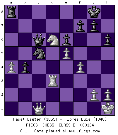 Last move : 0-1 2010 December 20 15:0:3 [Event "FICGS__CHESS__CLASS_B__000124"] [Site "FICGS"] [Date "2010.09.16"] [Round "1"] [White "Faust,Dieter"] [Black "Flores,Luis"] [Result "0-1"] [WhiteElo "1855"] [BlackElo "1848"] 1.d4 Nf6 2.Nf3 e6 3.Bg5 d5 4.e3 Be7 5.Nbd2 h6 6.Bh4 O-O 7.c3 c5 8.Bd3 Nc6 9.O-O b6 10.Ne5 Nxe5 11.dxe5 Nd7 12.Bxe7 Qxe7 13.f4 c4 14.Bc2 Nc5 15.b4 cxb3 16.axb3 a5 17.Rf3 Ba6 18.Rg3 Bd3 19.Bxd3 Nxd3 20.Qc2 Nc5 21.c4 Rad8 22.cxd5 Rxd5 23.Nc4 Qd8 24.Rf3 Nb7 25.Qe2 b5 26.e4 Rd7 27.Na3 Rd2 28.Qe1 Rd3 29.Qf2 Rd1+ 30.Rxd1 Qxd1+ 31.Qf1 Qd4+ 32.Kh1 b4 33.Nb5 Qxe4 34.Nd6 Qc6 35.Rd3 Nc5 36.Qc1 a4 37.bxa4 Ra8 0-1 Queen's pawn : Torre attack Kingside Castling by player Black (move 6) Kingside Castling by player White (move 9) Player Black won this chess game. Follow this game move after move (download)Winning isn't everything... but losing is nothing. (Mednis) Schach ist ein Kampf gegen den Fehler. (Johannes Herrman Zukertort) Tu no necesitas jugar muy bien, únicamente ayudar a tu oponenet a que juegue muy mal. (Genrikh Chepukaitis) Mais l'homme est une créature légère et illogique : semblable au joueur d'échecs, il n'aime que le processus du but à atteindre, non le but lui-même. (Dostoïevsky) Fortune favours the audacious. (Desiderius Erasmus)