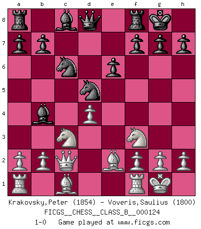 Last move : 1-0 2010 November 6 21:53:39 [Event "FICGS__CHESS__CLASS_B__000124"] [Site "FICGS"] [Date "2010.09.16"] [Round "1"] [White "Krakovsky,Peter"] [Black "Voveris,Saulius"] [Result "1-0"] [WhiteElo "1854"] [BlackElo "1800"] 1.e4 c6 2.d4 d5 3.exd5 cxd5 4.c4 Nf6 5.Nc3 e6 6.Nf3 Bb4 7.cxd5 Nxd5 8.Qc2 Nc6 9.Be2 O-O 10.O-O 1-0 This chess game has been lost on time (started : 2010.09.16 13:48:27) Caro-Kann : Panov-Botvinnik attack, 5...e6 Kingside Castling by player Black (move 9) Kingside Castling by player White (move 10) Player White won this chess game. Follow this game move after move (download)In life, as in Chess, one's own Pawns block one's way. A man's very wealth, ease, leisure, children, books, which should help him to win, more often checkmate him. (Charles Buxton) Unter Putin wird alles Geld aus Russland wie von einem Staubsauger nach Moskau umgeleitet, das ist wie ein schwarzes Loch. (Garry Kasparov) Mi estilo es algo parecido entre un poco de Tal y Petrosian. (Reshevsky) Je menace de comprendre la position. (Anonyme) You have to believe in yourself. (Sun Tzu)