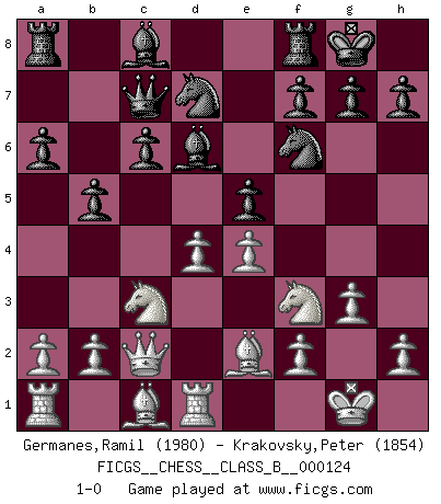 Last move : 1-0 2010 October 14 12:35:46 [Event "FICGS__CHESS__CLASS_B__000124"] [Site "FICGS"] [Date "2010.09.16"] [Round "1"] [White "Germanes,Ramil"] [Black "Krakovsky,Peter"] [Result "1-0"] [WhiteElo "1980"] [BlackElo "1854"] 1.d4 d5 2.c4 c6 3.Nf3 Nf6 4.Nc3 e6 5.e3 Nbd7 6.Qc2 Bd6 7.Be2 O-O 8.O-O dxc4 9.Bxc4 a6 10.Rd1 b5 11.Be2 Qc7 12.e4 e5 13.g3 1-0 QGD Slav : 4.Nc3 Kingside Castling by player Black (move 7) Kingside Castling by player White (move 8) Player White won this chess game. Follow this game move after move (download)You can only get good at Chess if you love the game. (Bobby Fischer) Als ich elf wurde, wurde ich einfach gut. (Robert James Fischer) Yo no le temo a Spassky. Todos saben que yo soy el mejor. Uno no necesita un torneo para probarlo. (Bobby Fischer) Que feriez-vous si vous étiez en train de jouer aux échecs et que la fin du monde arrive ? Je continuerais à jouer. (Saint Borromée) My poor ole parrot... Is not in the circulation of displays ....poo hoo hoo :) (Wayne Lowrance's enigma)