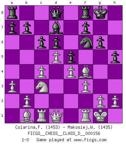 Last move : 1-0 2010 December 31 23:2:53 [Event "FICGS__CHESS__CLASS_D__000156"] [Site "FICGS"] [Date "2010.09.18"] [Round "1"] [White "Colarina,Floram"] [Black "Makosiej,Wladyslaw"] [Result "1-0"] [WhiteElo "1453"] [BlackElo "1435"] 1.d4 Nf6 2.c4 g6 3.Nc3 Bg7 4.e4 d6 5.Be3 O-O 6.Bd3 e5 7.Nge2 Bg4 8.f3 Bd7 9.O-O c6 10.Rc1 Na6 11.a3 Nc7 12.Ng3 Ne6 13.d5 Nf4 14.Bb1 h5 15.Nge2 Bh6 16.Nxf4 Bxf4 17.Bxf4 1-0 This chess game has been lost on time (started : 2010.09.18 8:33:45) King's Indian : 4.e4 Kingside Castling by player Black (move 5) Kingside Castling by player White (move 9) Player White won this chess game. Follow this game move after move (download)Everything is in a state of flux, and this includes the world of Chess. (Mikhail Botvinnik) Es hat in meinem Leben Zeiten gegeben, da ich sehr nahe daran war zu glauben, daß ich auch nicht eine einzige Schachpartie verlieren könnte. (José Raúl Capablanca) El jugador de combinación piensa hacia adelante; comienza de la posición dada y trabaja las movidas contundentes en su mente. (Emanuel Lasker) Le jeu d'échecs est comme rejeté hors du temps. (Antoine de Saint-Exupéry) All war is based on deception. (Sun Tzu)