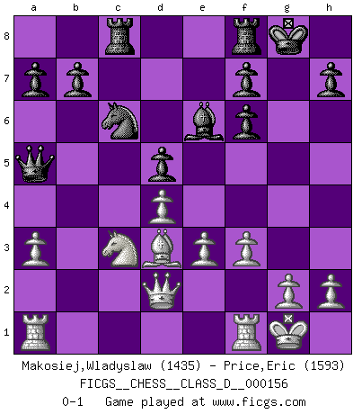 Last move : 0-1 2010 December 29 22:57:40 [Event "FICGS__CHESS__CLASS_D__000156"] [Site "FICGS"] [Date "2010.09.18"] [Round "1"] [White "Makosiej,Wladyslaw"] [Black "Price,Eric"] [Result "0-1"] [WhiteElo "1435"] [BlackElo "1593"] 1.d4 Nf6 2.c4 e6 3.Nc3 Bb4 4.f3 d5 5.a3 Bxc3+ 6.bxc3 O-O 7.Bg5 c5 8.cxd5 cxd4 9.cxd4 exd5 10.e3 Qa5+ 11.Qd2 Qb6 12.Bd3 Nc6 13.Bxf6 gxf6 14.Ne2 Qa5 15.Nc3 Be6 16.O-O Rac8 0-1 This chess game has been lost on time (started : 2010.09.18 8:33:45) Nimzo-Indian : Kmoch variation Kingside Castling by player Black (move 6) Kingside Castling by player White (move 16) Player Black won this chess game. Follow this game move after move (download)I give 98 percent of my mental energy to Chess. Others give only 2 percent. (Bobby Fischer) Schach ist wie eine schöne Frau, zu der wir ständig zurückkehren, gleichviel, wie oft sie uns zurückweist. (Anonymous) Bobby solo arroja las piezas y solas caen en las casillas correctas. (Miguel Najdorf ) Les erreurs sont comme les malheurs, elles n'arrivent jamais seules. (Siegbert Tarrasch) If you have any trouble condescending, find a Unix user to show you how it's done. (Scott Adams)