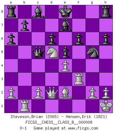 Last move : 0-1 2006 December 13 2:40:0 [Event "FICGS__CHESS__CLASS_B__000008"] [Site "FICGS"] [Date "2006.11.22"] [Round "1"] [White "Steveson,Brian"] [Black "Hensen,Erik"] [Result "0-1"] [WhiteElo "2065"] [BlackElo "1821"] 1.e4 c5 2.Nf3 d6 3.d4 cxd4 4.Nxd4 Nf6 5.Nc3 a6 6.Bg5 e6 7.f4 Qb6 8.Qd2 Qxb2 9.Rb1 Qa3 10.Be2 Be7 11.O-O h6 12.Bh4 Nbd7 13.f5 e5 14.Ne6 fxe6 15.fxe6 Nf8 16.Bxf6 gxf6 17.Nd5 Nxe6 18.Rf3 Qc5+ 19.Kh1 Ng5 0-1 Sicilian : Najdorf, 7...Qb6 Kingside Castling by player White (move 11) Player Black won this chess game. Follow this game move after move (download)Chess is a part of culture and if a culture is declining then Chess too will decline. (Mikhail Botvinnik) Wenn Du nicht kämpfst, um anderen etwas zu beweisen, sondern nur für Dich selbst, dann bist du fast unbesiegbar. (Garry Kasparov) Para mi, el Ajedrez es la vida y cada partida es como una nueva vida. Todo jugador de Ajedrez suele vivir muchas vidas durante su vida. (Eduard Gufeld) Avec des compensations pour le matériel en plus... (Anonyme) A bird doesn't sing because it has an answer, it sings because it has a song. (Maya Angelou)