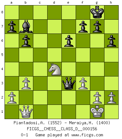 Last move : 0-1 2010 October 17 23:16:27 [Event "FICGS__CHESS__CLASS_D__000156"] [Site "FICGS"] [Date "2010.09.18"] [Round "1"] [White "Piantadosi,Angelo"] [Black "Meraiya,Harshil"] [Result "0-1"] [WhiteElo "1552"] [BlackElo "1400"] 1.c4 Nf6 2.d4 e6 3.Nc3 d5 4.Bg5 Be7 5.Nf3 O-O 6.e3 h6 7.Bh4 b6 8.Bd3 Bb7 9.cxd5 Nxd5 10.Bxe7 Qxe7 11.O-O Nd7 12.Rc1 Nxc3 13.Rxc3 c5 14.Qc2 cxd4 15.Nxd4 Rac8 16.Rc1 Rxc3 17.Qxc3 Rc8 18.Qd2 Rxc1+ 19.Qxc1 Nc5 20.Bb1 Qg5 21.Qf1 Na4 22.b3 Nc3 23.f3 Nxb1 24.Qxb1 Qxe3+ 0-1 English, 1...Nf6 (Anglo-Indian defense) Kingside Castling by player Black (move 5) Kingside Castling by player White (move 11) Player Black won this chess game. Follow this game move after move (download)On the chessboard, lies and hypocrisy do not survive long. (Emanuel Lasker) Wir können eben der zündenden Macht des Opfers nicht wiederstehen, denn die Begeisterung für das Opfer liegt in der Natur des Menschen. (Rudolf Spielmann) Cualquier cambio de material en una posición debe venir por medio de un mate, una captura o promoción de Peón. (Purdy) En blitz, le Cavalier l'emporte sur le Fou. (Vlastimil Hort) . 'gn is not allowed in chess unless n is an integer between 1 and 8 inclusive, where 1 and 8 are to interpreted as the standard numerals standing for integers in the ordered real-closed field R, with the *canonical* ordering. (As opposed to, say, an integer in the domain Z[2+i*sqrt(5)] or an integer in some exotic Grothendieck topos). (Normajean Yates)