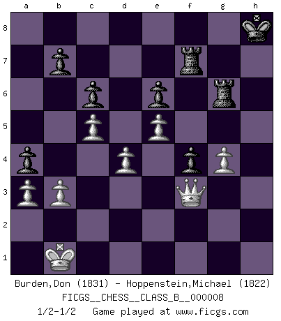 Last move : 1/2-1/2 2007 April 15 21:26:21 [Event "FICGS__CHESS__CLASS_B__000008"] [Site "FICGS"] [Date "2006.11.22"] [Round "1"] [White "Burden,Don"] [Black "Hoppenstein,Michael"] [Result "1/2-1/2"] [WhiteElo "1831"] [BlackElo "1822"] 1.e4 c6 2.d4 d5 3.exd5 Qxd5 4.Nc3 Qd6 5.Nf3 Nf6 6.Ne5 Nbd7 7.Nc4 Qc7 8.Qf3 Nb6 9.Ne5 Be6 10.Bf4 Nbd5 11.Bg3 Qb6 12.O-O-O g6 13.Bc4 Bh6+ 14.Kb1 Qa5 15.Ne4 Nxe4 16.Qxe4 O-O 17.Qf3 Bg7 18.Bb3 Qd8 19.Rhe1 a5 20.a3 Qc8 21.c4 Bxe5 22.Rxe5 Bg4 23.Qd3 f6 24.Re4 Nb6 25.c5 Nd5 26.f3 Bf5 27.Ka1 Kh8 28.Qe2 Bxe4 29.fxe4 Nc7 30.h4 Ne6 31.h5 gxh5 32.Qxh5 Rg8 33.Qh2 a4 34.Ba2 Rg7 35.e5 f5 36.Be1 Rg4 37.Bf2 Qd7 38.Rh1 Rg7 39.Qh5 Rf8 40.g3 f4 41.Bb1 R8f7 42.g4 Ng5 43.Bh4 Qd5 44.Bxg5 Rxg5 45.Qh3 e6 46.Bxh7 Qxh1+ 47.Qxh1 Rxh7 48.Qf3 Rf7 49.Kb1 Rg6 50.b3 1/2-1/2 Caro-Kann : Exchange variation Queenside Castling by player White (move 12) Kingside Castling by player Black (move 16) This chess game ended in a draw. Follow this game move after move (download)All I want to do, ever, is just play Chess. (Bobby Fischer) Capablanka war das größte Genie der Schachgeschichte! Aber denken sie nicht er habe nichts vom Schach verstanden. Er wusste nur soviel wie er wissen musste um seine Ziele zu erreichen. (Mikhail Moiseyevich Botvinik) Peones: ellos son el alma de esta partida, solos forman el ataque y la defensa. (Philidor) Aucun coup ne doit être joué sans but. (Pedro Damiano) A good aphorism is too hard for the tooth of time, and is not worn away with the centuries, although it serves as food for every speech. (Friedrich Nietzsche)