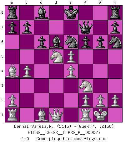 Last move : 1-0 2010 November 28 17:21:15 [Event "FICGS__CHESS__CLASS_A__000077"] [Site "FICGS"] [Date "2010.09.18"] [Round "1"] [White "Bernal Varela,Nelson"] [Black "Guex,Pascal"] [Result "1-0"] [WhiteElo "2116"] [BlackElo "2168"] 1.e4 e5 2.Nf3 Nc6 3.Bb5 Qe7 4.O-O Nd8 5.d4 c6 6.Ba4 d6 7.c4 f6 8.Nc3 g6 9.b4 Nh6 10.Nd5 Qf7 11.c5 Ne6 12.cxd6 Bxd6 13.dxe5 1-0 Ruy Lopez : Vinogradov variation Kingside Castling by player White (move 4) Player White won this chess game. Follow this game move after move (download)No one ever won a game by resigning. (Unknown) Ich bin Weltmeister und muß mit niemandem irgend etwas diskutieren. (Viswanathan Anand) Te sientas frente a un tablero y repentinamente tu corazón brinca. Tu mano tiembla al tomar una pieza y moverla. Pero lo que el Ajedrez te enseña es que tu debes permanecer ahí con calma y pensar de que si realmente es una buena idea o de que si hay otras ideas mejores. (Stanley Kubrick) Les Echecs ne sont pas pour les âmes timides. Ils requièrent un homme entier, qui ne s'arrête pas aveuglément à ce qui a été déjà établi, mais qui tente individuellement de sonder les profondeurs du jeu. (W. Steinitz) If you are good, you will be assigned all the work. If you are really good, you will get out of it. (Dan Rotaru)