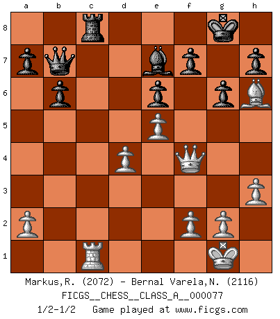 Last move : 1/2-1/2 2011 January 12 13:6:45 [Event "FICGS__CHESS__CLASS_A__000077"] [Site "FICGS"] [Date "2010.09.18"] [Round "1"] [White "Markus,Roland"] [Black "Bernal Varela,Nelson"] [Result "1/2-1/2"] [WhiteElo "2072"] [BlackElo "2116"] 1.e4 c5 2.c3 Nf6 3.e5 Nd5 4.d4 cxd4 5.Nf3 e6 6.cxd4 d6 7.Bc4 Nc6 8.O-O Be7 9.Qe2 O-O 10.Nc3 Nxc3 11.bxc3 dxe5 12.dxe5 Qc7 13.Bd3 b6 14.Qe4 g6 15.Bh6 Rd8 16.Rfd1 Bb7 17.Qf4 Rd5 18.Be4 Rc5 19.h3 Rc4 20.Nd4 Nxd4 21.Rxd4 Rxd4 22.cxd4 Rc8 23.Bxb7 Qxb7 24.Rc1 1/2-1/2 Sicilian : Alapin's variation (2.c3) Kingside Castling by player White (move 8) Kingside Castling by player Black (move 9) This chess game ended in a draw. Follow this game move after move (download)I still hope to kill Fischer. (Boris Spassky) Immer nach dem besten Zug zu suchen ist ziemlich unpraktisch. (Nigel Short) Si yo gano un torneo, yo lo gano por mí mismo. Yo hago las jugadas. Nadie me ayuda. (Bobby Fischer) La victoire dans une partie d'Echecs appartient la plupart du temps à celui qui voit un peu plus loin que l'adversaire. (Lasker) A good book on your shelf is a friend that turns its back on you and remains a friend. (Author unknown)