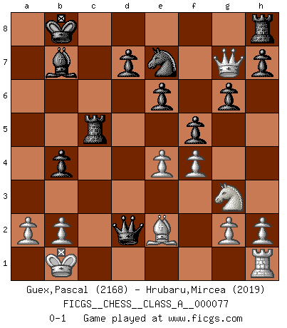 Last move : 0-1 2011 March 12 11:52:54 [Event "FICGS__CHESS__CLASS_A__000077"] [Site "FICGS"] [Date "2010.09.18"] [Round "1"] [White "Guex,Pascal"] [Black "Hrubaru,Mircea"] [Result "0-1"] [WhiteElo "2168"] [BlackElo "2019"] 1.e4 c5 2.Nf3 Nc6 3.d4 cxd4 4.Nxd4 Qc7 5.Nc3 e6 6.f4 a6 7.Nxc6 Qxc6 8.Bd3 b5 9.Qe2 Bb7 10.Bd2 Bc5 11.O-O-O Ne7 12.Qh5 g6 13.Qh6 b4 14.Ne2 f5 15.Ng3 O-O-O 16.Kb1 a5 17.c3 Kb8 18.cxb4 axb4 19.Rc1 Qd6 20.Be2 Qxd2 21.Rxc5 Rc8 22.Qg7 Rxc5 0-1 This chess game has been lost on time (started : 2010.09.18 8:53:55) Sicilian : Flohr variation Queenside Castling by player White (move 11) Queenside Castling by player Black (move 15) Player Black won this chess game. Follow this game move after move (download)Many Chess players were surprised when after the game, Fischer quietly explained: 'I had already analyzed this possibility' in a position which I thought was not possible to foresee from the opening. (Mikhail Tal) Rubinstein ist ein Turmendspiel, welches die Götter vor tausenden von Jahren begannen. (Savielly Grigorievitsch Tartakower) Nada excita más a Grandes Maestros aburridos que una novedad teórica. (Dominic Lawson) Vous n'êtes pas toujours obligé de jouer le meilleur coup. Un coup doit être actif, entreprenant, correct et beau ! (David Bronstein) The right perception of any matter and a misunderstanding of the same matter do not wholly exclude each other. (Kafka's the trial)